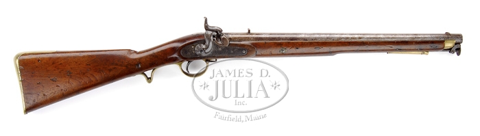 PATTERN 1844 YOEMEN CARBINE. SN NSN. Cal. .65. 20″ smooth bore bbl with blade front sight, standing leaf rear, and mounted with swivel ramrod bayonet. Breech area of bbl has numerous crown over proof marks. Lock-plate is marked with a large “Crown/V-R Tower” in front of hammer, and a small crown over “V” and dated, “1844.” Left side of stock is mounted with sling bar and ring. Just behind is an initial stamped, “J.F.” Center of stock on left side is stamped with a large, “J9” over “Qory”, which is a unit marking for a British Yeomanry unit. Right side of stock has an inverted “V” over “BO” and a “44” over “7”. Behind brass trigger guard in toe line are two crown stamps and further down stamped, “Sargent.” Mounted with uncheckered 1-pc stock, brass nose cap, single brass ferrule, brass trigger guard, and brass butt-plate with long top tang. CONDITION: Very good. Bbl is a mixture of brown and silver patina. Lock-plate is a silver hardened color in protected areas, and dark gray patina on balance. Wood is sound with numerous nicks and dings, and retains a fine hand patina oil finish. Mechanics are crisp and bore is dark with moderate pitting. 4-31749 BDT270 (2,000-4,000)