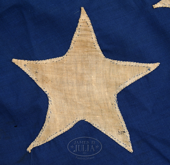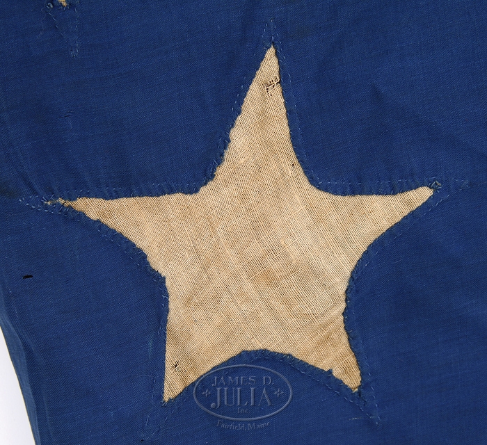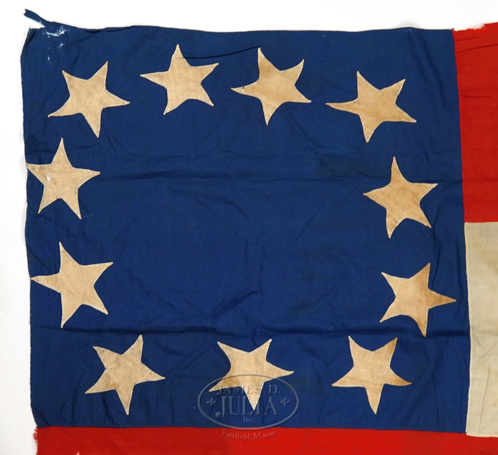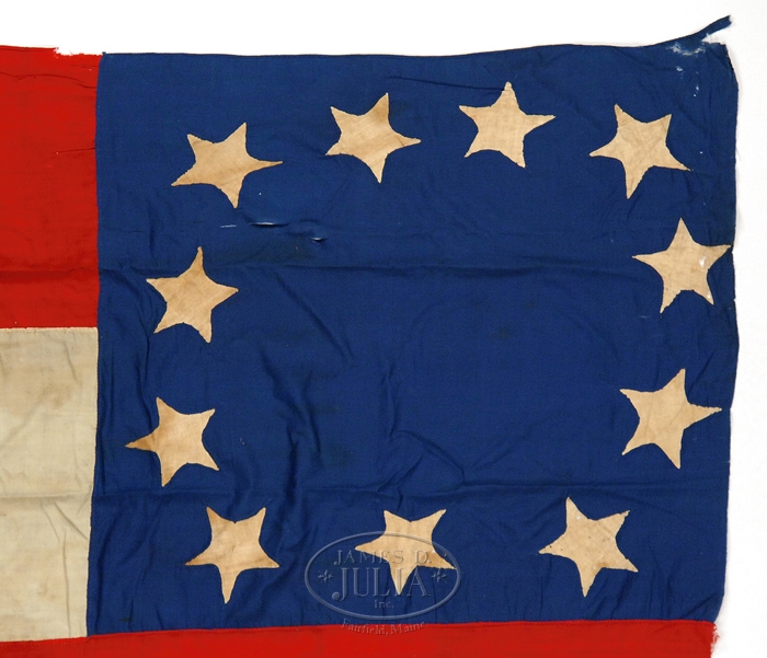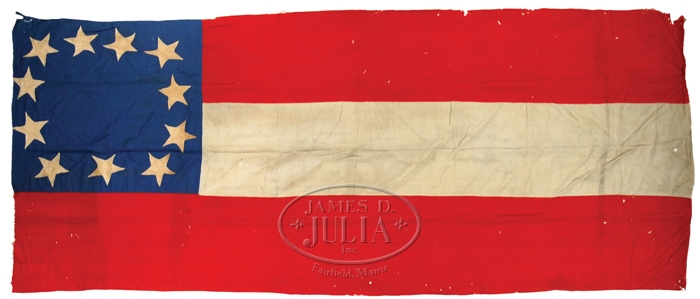 1ST NATIONAL CONFEDERATE FLAG OF GENERAL GUSTAVUS SMITH 118” x 52”. Rarely are offered Confederate flags with such good provenance and history as this one. Five United Confederate veteran letters are associated with this flag which read as follows: “Kentucky Division, United Confederate Veterans John C. Breckinridge Camp, 100, United Conf. Veterans “Leafland” near Lexington Ky. Thirteenth of Oct. 1896 My Dear Col Morriss- It was my misfortune to be absent from from(sic) “Leafland” for a few days when your letter of Oct 9th reached there. It has only this minute been read by me & I beg of you to pardon my delay. To be in Richmond again as the daughter of a true Confederate soldier would be indeed a great pleasure but sir -nothing- & I can say it truly- could add more to my happiness than to be present on Thursday next & tenderly pass over to the Ladies of the Memorial Museum of Richmond the flag of Gen. Smith around which so many sad & loving memories. Yes- to place it with the loving hands in the very room where hangs the flag of the old Orphan Brigade- & other trophies of Ky’s proud sons. You are right- As time rolled on- Ky gave her best- her truest- her noblest & so our treasures one by one all by the fattlefield were won & high around these stood Gustavus W. Smith. I can not be with you in person, but my heart goes forth in gratitude & tears come unbidden to my eyesas I thank you for the honor confered on Ky. “They bid us tell the story of our nation’s golden past and sing her hymns of Conquests and chant her dirge at least but when thr wounds are fresh and quivering.Is there any place for art? Can we present the stories graven on the tablets of the heart? In no truer, no more tender hands could you have placed this sacred trust than in the hands of the Grand Confederate Women of Richmond. Ou cause, our veterans, our relicts shall ever live in my heart- Our poet priest of the SOuth thus speaks to us in the conquered banner- “Touch it not -unfold it never- Let it drop- there unfurled forever- for its peoples hopes are dead.” We of the dear Southland would say unfurl those banners- not in war but in peace. Carry them on high- show to the world they are dear to us yet – build a Memorial faster- more magnificent than any on our Globe. Say to our people although all was once dark & drear- bright and joyous days have come- & we love “their curse” with a better love, & a fonder devotion then ever- Allow me again to thank you for your great kindness & on next Thursday may the bright & beautiful sun shine forth in all its glory- just kiss with its warmth & brightness. The stains of time upon the silken folds of the flag that Ky once bore so proudly. Most Cordially Yours Julia Hughes Spurr Sponsor Ky. Division UCV 1896 Pine Grove, Ky” This flag is made of cotton with 11 sewn through stars. Based on the dimensional ratio, construction and materials, this flag was most likely early war. Howard Madaus, in his notes, states he felt this flag was probably Gen. Smith’s headquarter flag in VA in 1861. Gen. Smith probably would have had this flag in his possession on his last appointment near Savanna, GA 1864 and 1865. Gen. GUSTAVUS SMITH was born in KY and graduated from West Point prior to the Mexican War where he saw service and was also an instructor at West Point. Smith was commissioned Maj. Gen. in the Confederate Army in Sept, 1861. He commanded a brigade of the Army of Northern Virginia during the Peninsula Campaign. He commanded the entire army for a portion of the battle of Seven Pines after Gen. Joseph E. Johnston was wounded. We feel this flag would have accompanied Gen. Smith during this campaign. Gen. Smith served as Secretary of War for the Confederacy during Nov. of 1862. He resigned early in 1863, but was appointed Maj. Gen. of the Georgia Militia, to organize Georgia State forces and lead troops during the Atlanta Campaign. This is a fabulous flag with vibrant colors, great history and provenance that will display beautifully. Confederate cotton flags are scarce and generally are much better preserved than their silk or wool counterparts; cotton flags such as this are much easier to conserve and frame. CONDITION: Very good overall, with good strong colors and only scattered tears, loose stitches and holes. As mentioned in description, flag is missing its hoist. Documents associated are good overall. 4-32587 JS11 (35,000-50,000)