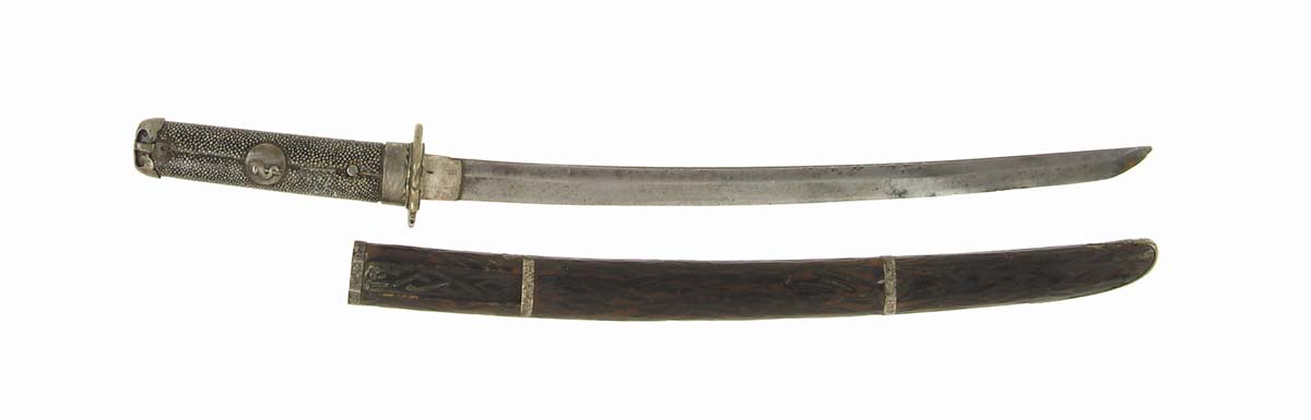 JAPANESE MOUNTED WAKIZASHI. 15” narrow shinogi zukuri blade, cannot remove tsuka to check if there is a mei. SIZE: 23”long overall. MOUNTS: All of the fittings are silver-plated over copper and brass. Hari menuki, one of Daruma, the other of a sahie, this tsuka never had tsuka ito (wrap). CONDITION: Blade is gray. Forging is unclear and is bent with some nicks. Lacquered saya is deeply carved to resemble wood bark. Minor dings and rubs to that finish. Has pocket for a kuzuka, no longer with it. Some wear to the silver finish of the mounts. 4-53742-15 GA15 (300-500)