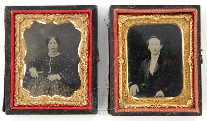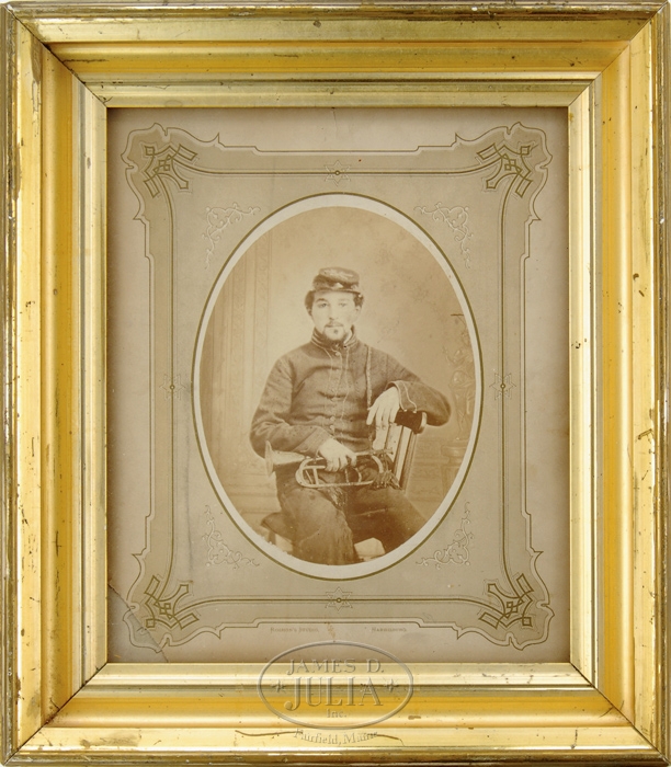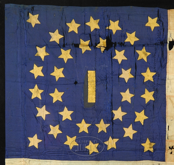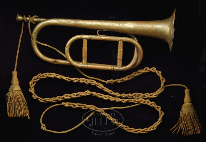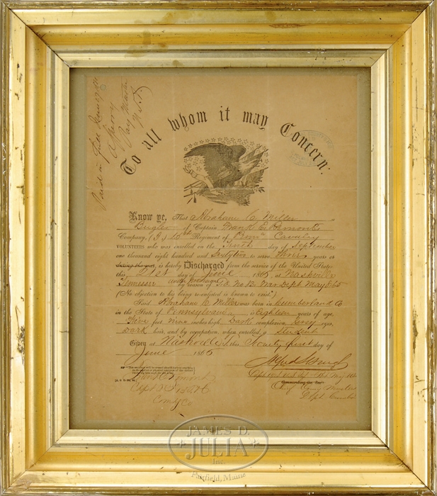 34 STAR, SWALLOWTAIL, CIVIL WAR GUIDON OF COMPANY I, 15TH REGIMENT PENNSYLVANIA CAVALRY, PRESENTED TO THE COMPANY’S BUGLER, CAPTAIN ABRAHAM CLARENCE MILLER. ACCOMPANYING ARE MILLER’S BUGLE, A PHOTO OF MILLER HOLDING HIS BUGLE, HIS DISCHARGE PAPERS, AND 23 FIELD-WRITTEN LETTERS. 34 star, swallowtail, Civil War guidon of Co. I, 15th Regt PA Cav, presented to the company’s bugler, Capt. Abraham Clarence Miller. The flag comes with a tremendous amount of related material and provenance and was kept in Miller’s family until 2003. Accompanying the flag are the following articles: ? Miller’s Civil War-carried brass bugle and sash (archivally framed in period gilt molding) ? An albumen photo of Miller holding this exact bugle with the sash over his shoulder (also archivally framed in period gilt) ? Miller’s discharge papers (also archivally framed in period gilt) ? 23 letters that were written by Miller in the field. ? A pair of ¼ plate tintype photos picturing Miller and a woman who may be his wife, (Margaret), or possibly his sister, together in their original press-decorated gutta-percha cases. ? A fairly extensive number of other related papers and items, including a copy of Miller’s file from the Nat. Archives showing muster rolls, etc., his certificate to teach school (gained in 1866 immediately following the war), a small homespun linen bag with a script initial “M”, found in a mid-19th C. lap desk in the family home, and other interesting paper documents. ? Two early 20th C photographs of the flag and a late 20th C. photograph of the bugle, discharge papers, and albumen photo, as they hung in their previous frame in the family home. This is a real Civil War carried flag that was truly used and reflects that usage. This is the proper state for a flag not put away for safekeeping, but issued to a Civil War unit and carried on horseback throughout the muck, mud and blood-strewn fields, woods, and rivers of the worst war ever witnessed on American soil. This is particularly true for land-use, Union army, Civil War battle flags and guidons, which were made of fine silk with painted stars and other elements. Some flags saw less use than others, of course, but those that were carried for a prolonged period should show appropriate wear. So use is one reason for losses, but other reasons include the acidity of paint and the caustic nature of the mineral salts and other weighting agents used in the fabric. In the period between 1820 and 1850, silk merchants began to sell silk by weight instead of length. To make it heavier, weighting agents were added to the fabric. These increased the price that could be obtained but were harmful to the fabric over time. This is why most all silk flags made between 1820 and the 1st quarter of the 20th century (which encompasses most flags carried by ground forces) exhibit some degree of breakdown. If you have ever visited an armory and seen the state of Civil War period, Union flags rolled on their staffs within glass display cases, know that a combination of hard outdoor use, manner of construction, and manner of storage accounts for their present condition, which, more often than not, is far beyond the largely intact state of this particular swallowtail guidon. The flags eventual owner, Abraham Clarence Miller of Harrisburg, mustered in at the Carlisle, Pennsylvania Barracks on September 10th, 1862 for a three year term of service. He was 18 years old at the time. An experienced veteran soldier by the war’s end, he was discharged as the company bugler in Nashville, TN on June 21st, 1865. Miller then returned to PA, where he became a school teacher (as evidenced by his teacher’s certificate, included in this grouping). He died in Harrisburg in 1906 at the approx age of 62. Sometime after his death the family (or a portion thereof) moved to Hagerstown, MD, taking the flag with them, where it remained until 2003. The aged woman who owned the flag relayed that she was effectively the last of his direct descendents and, having no further use for it in her old age, decided to sell it. Included as part of item (7) on the above list are photos taken inside and outside of her home of the flag and some of the other objects. Twenty three of Miller’s hand-written letters accompany the lot. These detail, among other things, various battles of the war, grumblings about various officers, etc. It is reported that somewhere in the letters Miller speaks of his encounter with David Boone, son of Daniel Boone, who bragged about his father. But we have not had the time to read them thoroughly and so can not attest to the fact. All the documentation one could reasonably wish for and more to accompany Civil War relics is present. The 15th PA. Cav. fought primarily in the Western Theater, particularly in TN and AL. According to “Advance the Colors: A Survey of Pennsylvania Civil War battle flags”, by Richard A. Sauers, Capital Preservation Committee, 1991, this is the only known surviving guidon of the 15th PA. Cav. The guidon of Co L did exist into the 20th C. It was received by the PA State Adj. Gen.l on July 20th, 1920, then sent to the PA. State Arsenal, but it has since disappeared. A relatively large number of Civil War era bugles exist, but an identified bugle with its original sash, pictured with the soldier who carried and blew it during the war, is a very rare find. Though we are sure others exist with such documentation, we have never encountered one and they are remarkably rare. The albumen photo is large in size, which makes it a great visual compliment to the grouping. It was taken by Roshon’s Studio in Harrisburg, and shows Miller in full uniform, complete with kepi, holding the bugle with the sash draped over his shoulder. Roshon Commonwealth Gallery was located at 19 N 3rd St. and a photographer by the name of John W. Roshon was its proprietor. His photographs appear in the State Archives from 1866-1955. The studio evidently provided thi