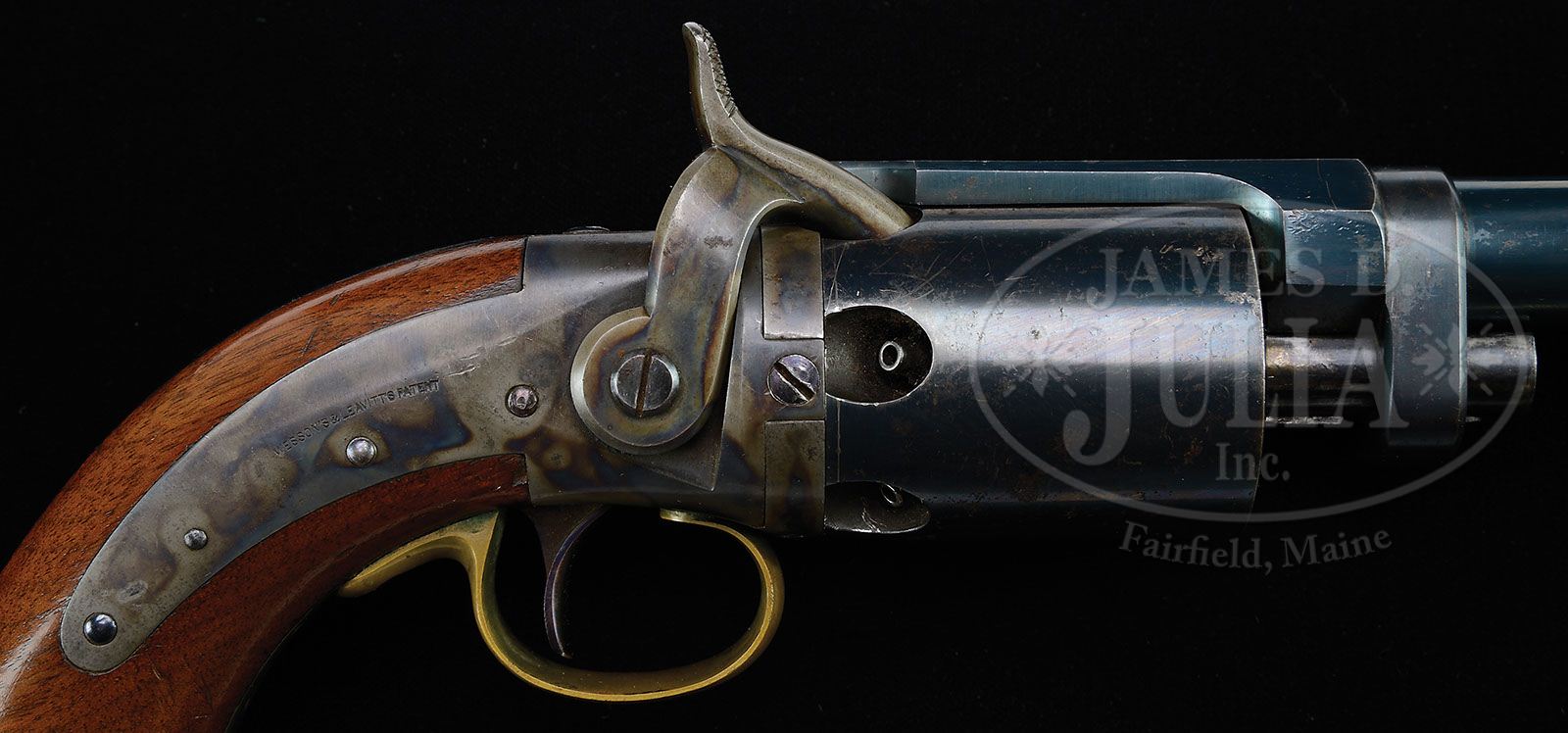 RARE WESSON & LEAVITT DRAGOON PERCUSSION REVOLVER. SN 111. Cal. 40. Blue & color case hardened with 7-1/8″ rnd bbl, German silver front sight and a tiny fixed sight at rear of top strap. Top strap is marked “MASS ARMS CO / CHICOPEE FALLS”. Frame & cyl spindle are color case hardened as is the right side mounted back action lock. Cylinder is 6-shots with convex front edge, contoured to mate with the angle of the bbl forcing cone. Cyl is unfluted & smooth with a square rear face that has stop notches. Nipples are set in angled recesses. Brass trigger guard is attached to the bottom of the receiver & front strap. Mounted with a varnished 1-pc walnut grip with matching SN on front face under the wood. Back strap & butt strap are 1-pc blued steel with matching SN on inside near the tip. Front face of recoil shield is also matching numbered. According to Flayderman’s Guide to Antique American Firearms only about 770 of these rare revolvers were produced in the period 1850-1851, some of which had factory attached rammers. CONDITION: Extremely fine plus, all matching. Overall retains virtually all of its crisp orig finish with glossy bright blue on bbl, top strap, bbl latch & back strap; frame, lockplate & hammer retain virtually all of their lightly faded orig case colors, strong & bright on lockplate; back strap has glossy bright blue. Grip has a few light nicks & dings and a series of shallow bruises on left side, otherwise is sound and retains virtually all of its orig factory varnish. Mechanics are crisp, brilliant shiny bore, probably unfired. 4-47358 JR182 (20,000-30,000)