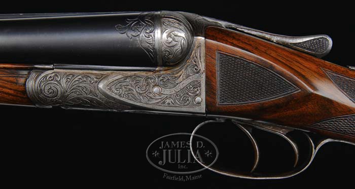*RARE A. H. FOX B GRADE SIDE-BY-SIDE SHOTGUN. SN 21877. Cal. 12 ga. 30″ Krupp Fluid Steel bbls with tapered, matted, concave rib with sgl silver sighting bead, 2-3/4″ chambers, choked MOD / IMP-MOD, dbl triggers & extractors. Chamber areas have 3/4″ wedge of scroll engraving. Right bbl marked “Krupp Fluid Steel Made By” and left “A. H. Fox Gun Co. Phila. PA.”. This later style B engraved receiver is a bold foliate scroll with shaded backgrounds and ribbons with “Ansley H. Fox” on each side & 2 grouse in flight with hills in background on bottom of receiver. Mounted with a striking piece of streaked walnut with checkered side panels, checkered rounded pistol grip & serrated hard rubber butt plate. Checkered splinter forend. Bore diameter: left -.728, right -.729. Bore restrictions: left -.030, right -.020. Wall thickness: left -.026, right -.025. Drop at heel: 2-3/4″, drop at comb: 1-5/8″. Weight: 6 lbs. 14 oz. LOP 13-7/8″. Gun is accompanied by a vintage leg-of-mutton case. PROVENANCE: The David Herrmann Collection. CONDITION: Very fine. Bbls retain 95% orig blue with slight muzzle wear & the expected minor light nicks & scratches. Receiver has 50-60% visible case colors with balance a gray silver patina. Trigger guard only traces of orig blue & mostly silver patina. Stock is sound with tiny chip behind top tang, only a few minor light handling marks & extremely fine hand-rubbed finish. Forend is sound with matching fine hand-rubbed finish. Mechanics are crisp with shiny bores. 4-35259 BDT22 (5,000-7,000)