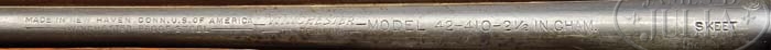 *RARE WINCHESTER MODEL 42 SKEET WITH SOLID RIB AND 2-1/2″ CHAMBER. SN 87625. Cal. 410. 28″ solid rib bbl with sgl silver sighting bead. Left side of bbl is marked “MADE IN NEW HAVEN.CONN.U.S. OF AMERICA/WINCHESTER PROOF STEEL-WINCHESTER/TRADE MARK-MODEL 42-410-2-1/2″IN.CHAM.” Adjacent to receiver is stamped “SKEET” with Winchester proof mark on left side of rib and top of adjacent receiver. Standard receiver with serrated top, mounted with streaky straight grain walnut, checkered pistol grip with Winchester hard rubber grip cap, Winchester hard rubber buttplate, and checkered skeet forend. Bore measurements are unavailable for for 410. Drop at heel: 2-1/4″. Drop at comb: 1-7/16″. Weight 6lbs. 2oz. LOP 13-15/16″. CONDITION: Fine. Bbl retains 75-80% thinning orig blue with minor muzzle wear, thinning on right side forward of forend, thinning through chamber area with rub mark from forend, minor nicks & scratches, and rubbing on bottom of bbl from takedown. Receiver retains 85% orig blue, thinned to silver across bottom and sharp edges, a couple small areas of shallow faint surface oxidation. Stock is sound with handling marks, nicks & dings, and retains orig finish blending with hand worn patina. Forend is sound with slightly filled checkering, typical nicks & dings and retains a thin coat of added finish, blending with hand worn patina. Mechanics are crisp with nice shiny bore. 4-38765 BDT65 (4,000-6,000)