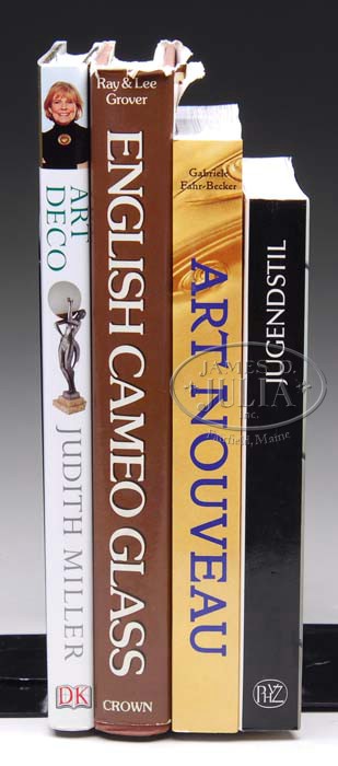 LOT OF FOUR BOOKS. Hardbound book entitled Collector’s Guide to Art Deco by Judith Miller, hardbound English Cameo Glass by Ray and Lee Grover, paperback Art Nouveau by Gabriele Fahr-Becker and Jugendstil im Landesmuseum Mainz. CONDITION: Overall very good. 5-69130-4 (100-200)
