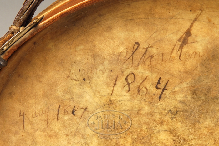RESTORED DRUM OF L. B. STRATTON OF THE 89TH NEW YORK VOLUNTEER INFANTRY. This snare drum, 15” in diameter x 10” tall, was rebuilt and refinished in Oxford, New York in 1918 by Howard C. Bartlett, and is so written inside drum. An orig, Civil War, patriotic label is not easily discernible. Written on top head is “L.B. Stratton/August 4, 1864” along with partial regimental information “89th. . C. (or G.?) Bower (or Bowers?)”. The family who consigned this drum is directly descended from the restorer of the drum, who lived in Oxford, N.Y. Consignor surmises as follows: “According to New York in the War of the Rebellion, 3rd Ed, by Frederick Phisterer (J.B. Lyon, 1912), the Hon. J.S. Dickinson received authority, August 29, 1861, to recruit a regiment of infantry; this regiment (the 89th) was organized under Col. Harrison S. Fairchild and Lieut.-Col J.C. Robie, at Elmira November 26, 1861, and there mustered in the service of the United States for three years December 4, 5 and 6, 1861. At the expiration of its term of enlistment those entitled thereto were mustered out, and the regiment retained in service. During its service the regiment lost by death, killed in action, 4 officers, 49 enlisted men; of wounds directly received in action, 2 officers, 52 enlisted men; of disease and other causes, 1 officer, 158 enlisted men; total, 7 officers, 259 enlisted men; aggregate, 266; of whom 13 enlisted men died in the hands of the enemy. The 89th was in siege operations against Petersburg and Richmond from June 16, 1864, to April 2, 1865. This encompasses the date inscribed on the drum head (4th Aug 1864). A Gilbert (G.) Bowers, who was a mason, served in Company E of the 89th Regiment. He enlisted at age 43 at Oxford for three years and mustered in as a private on Jan. 4, 1864. He was discharged on May 26, 1865 at Stuart Hospital in Richmond, Va. and filed for a military pension March 25, 1867. The name on the drum that is more legible is L.B. Stratton. We suspect (but have not yet been able to confirm) that this is actually Whitman Stratton, who also served in Company E of the 89th. Whitman Stratton (also Straton), was mustered in as a private in Co. E on October 7, 1861. He was promoted to sergeant (no date available), was discharged on October 7, 1864, and applied for a military pension on July 2, 1890. CONDITION: Very good as restored; slight tear in bottom drum skin.. 4-31591 JS268 (1,000-2,000)