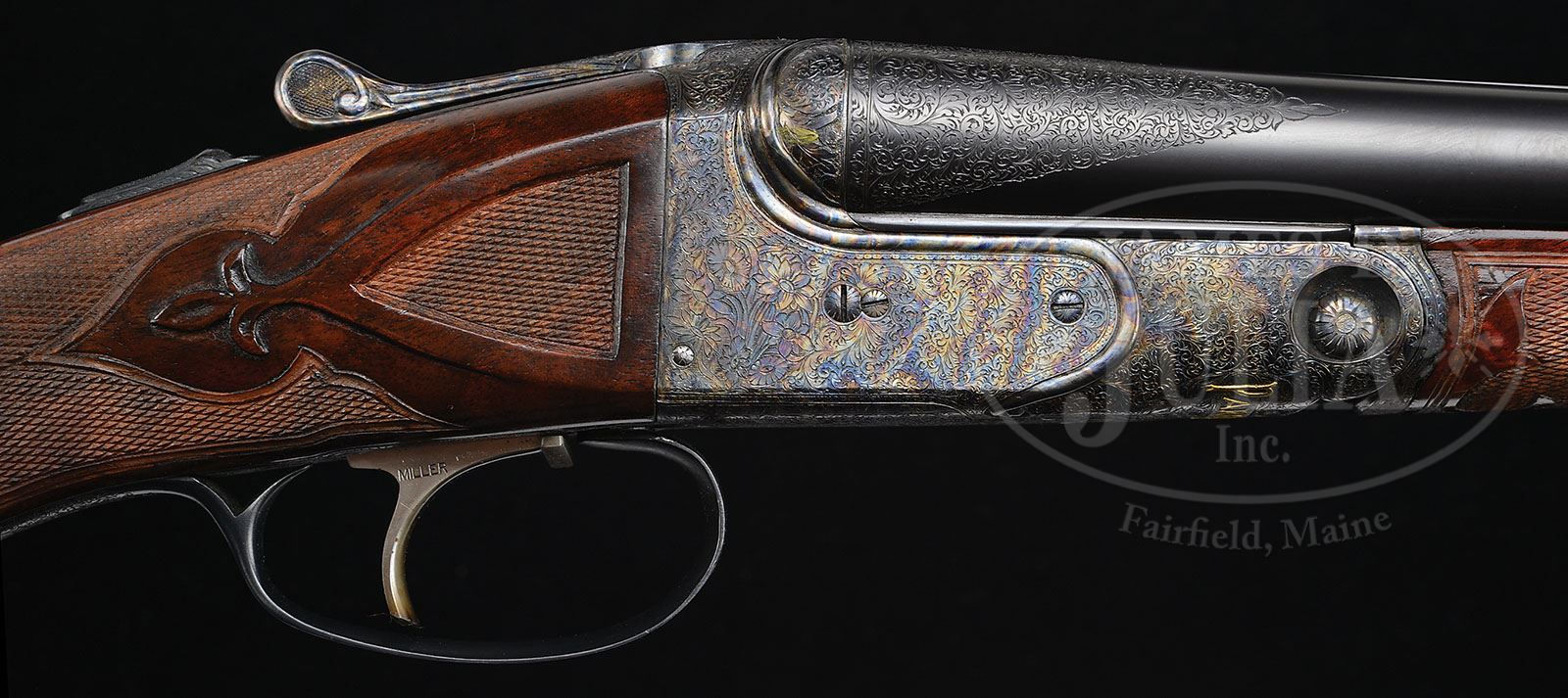 *BEAUTIFUL 20 GAUGE PARKER A1 SPECIAL UPGRADE WITH CASE. SN 217795. Cal. 20 ga. 2-1/2″ Chambers. 0 Frame. Parker Gun Identification and Serialization ledger lists this gun as a VHE with capped pistol grip, 20 ga. with 28″ bbls. It remains in this configuration except has been upgraded to A1 Special with “Peerless Steel” added to line on rib, 2-3/4″ triangles of scroll engraving added to breech ends, and with 1-1/2″ triangles at muzzles. Bbl flats are stamped with Peerless Steel crossed “P” logo, along with orig Parker Overload proofs. Water table is stamped “A1S” in lozenge, and with “8”. Action has had fences refiled with three beads, the bottommost wrapping around transition of sides to rounded portion of action, with scrolled tips. Action is engraved with small scroll framing floral bouquets. “Parker Bros” is relief gold inlaid around bottom of action. Action features non-automatic safety (S gold inlaid) and Miller selective single trigger. Scroll engraved trigger guard has SN relief gold inlaid at grip. Well shaped, flame figured American walnut buttstock measures 14-5/8″ over engraved skeleton steel buttplate. Butt checkering is inside 1/8″ uncheckered border, and is pierced by two fleur-di-lis. Side panels with inset checkering have well carved fleur-di-lis drop points. Checkering of grip is in typical A 1 Special style with crenelated mullered borders, and flourishes extending toward butt. Composition grip cap is inset with large gold oval with scroll engraved border and initials “R. F. M.” Matching splinter ejector forend is nearly fully checkered with flat carving at rear, and fleur-di-lis extending into pattern. Bore diameter: left-.614, right -.616. Bore restrictions: left -.014 (Mod), right -.007 (IC). Wall thickness: left -.026, right -.029. Drop at heel: 2-3/4″, drop at comb: 1-5/8″. Weight: 6 lbs. 8 oz. LOP: 14-5/8″. Tan leather case with leather corners and leather trimmed canvas outer cover, is lined in green felt with black leather gold embossed “The Parker Gun” label, and contains two keys. CONDITION: Excellent, essentially unfired since upgrade, retaining all of its custom finishes on wood and metal, with only one or two minor marks. Bores are excellent. Action is tight. Ejectors are in time. Trigger works. Case is excellent. 4-49283 MGM107 (10,000-15,000)