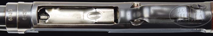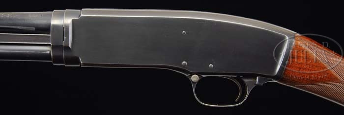 *PRE-WAR WINCHESTER MODEL 42 SKEET GUN. SN 6331. Cal. 410. 26″ plain bbl with red Bradley sighting bead, left side of bbl is marked “Winchester / Proof Steel – Model 42 – Winchester / Trademark – .410 – 3in. Skeet”. Right side “Made in U.S.A. Winchester Repeating Arms Co / New Haven.Conn. – Patents Pending”. Standard unmarked receiver with serrated top mounted with streaky straight grain walnut, checkered straight grip, Winchester logo, hard rubber buttplate and checkered extended target forend. Bore measurements are unavailable for 410. Drop at heel – 2-3/8″, drop at comb – 1-1/2″, weight – 5 lbs 14 oz and LOP 13-7/8″. CONDITION: Very fine, bbl retains 95-97% orig blue with some minor muzzle wear, some minor surface oxidation in forearm area, rub mark on each side from forend, magazine tube retains 90% orig blue with rub mark from forend and lightly thinning from take-down. Receiver retains 97-98% orig blue with some thinning on sharp edges and some very minor surface oxidation on lower left side near trigger. Stock is sound with slightly filled checkering, some minor nicks and scratches and light handling marks and retains orig finish that appears to have been waxed. Forend is sound with slightly filled checkering, typical nicks and dings, some flaking of finish on back portion blending with hand worn patina and retains orig finish that appears to have been waxed. Mechanics are crisp with a nice shiny bore. 4-36383 BDT50 (2,000-3,000)