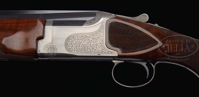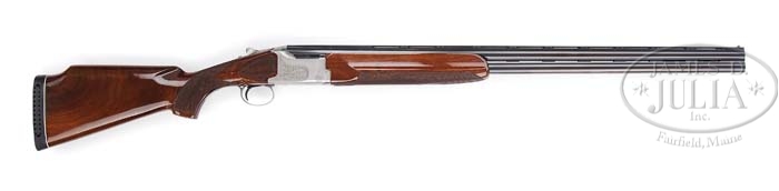 *WINCHESTER MODEL 101 PIGEON GRADE TRAP GUN. SN PK412190. Cal. 12 ga. 30″ bbls with ventilated broadway trap rib, dual ivory sighting beads, IMP.MOD/FULL chokes, 2-3/4″ chambers, ejectors and sgl selective trigger. Top of rib is marked “Pigeon Grade”, left side of bbl is marked “Winchester – 12 gauge 2-3/4″ / New Haven, Conn. / U.S.A.” and right side “Made in Japan”. The gray receiver is scroll engraved on sides, a pigeon engraved center of bottom and “Winchester” in script. Mounted with nicely figured walnut, checkered side panels, checkered pistol grip, Monte Carlo, Winchester marked black ventilated pad and checkered finger groove target forend. Bore diameter: top – .729, bottom – .729. Bore restrictions: top – .032, bottom – .023. Wall thickness: top – .035, bottom – .034. Drop at heel: 2-1/16, drop at comb: 1-3/8. Weight: 8 lbs. 4 oz. LOP 14-1/2. Accompanied by light tan luggage case with fuzzy gold lining and Winchester label on inside cover. CONDITION: Extremely fine, appears to be test fired only. Bbls retain virtually all orig blue with a few minor handling marks. Receiver retains virtually all it’s orig factory finish. Stock is sound with minor handling marks and a couple minor scratches and retains virtually all its orig finish. Forend is sound with some minor nicks and dings and retains virtually all its orig finish. Mechanics are crisp with non-automatic safety, strong ejectors, shiny bores, appears to be test fired only. Case is in excellent condition with some minor light scuffing to exterior. 4-38113 BDT38 (1,800-2,200)