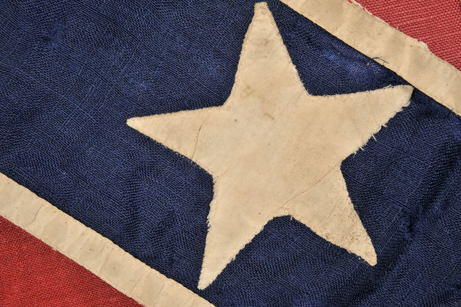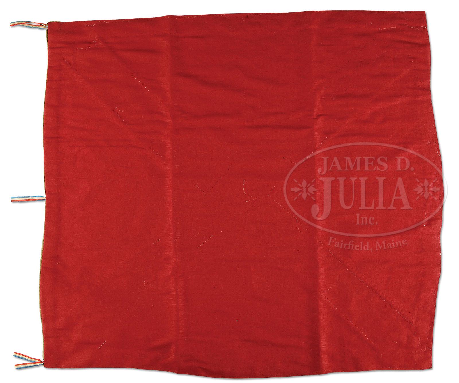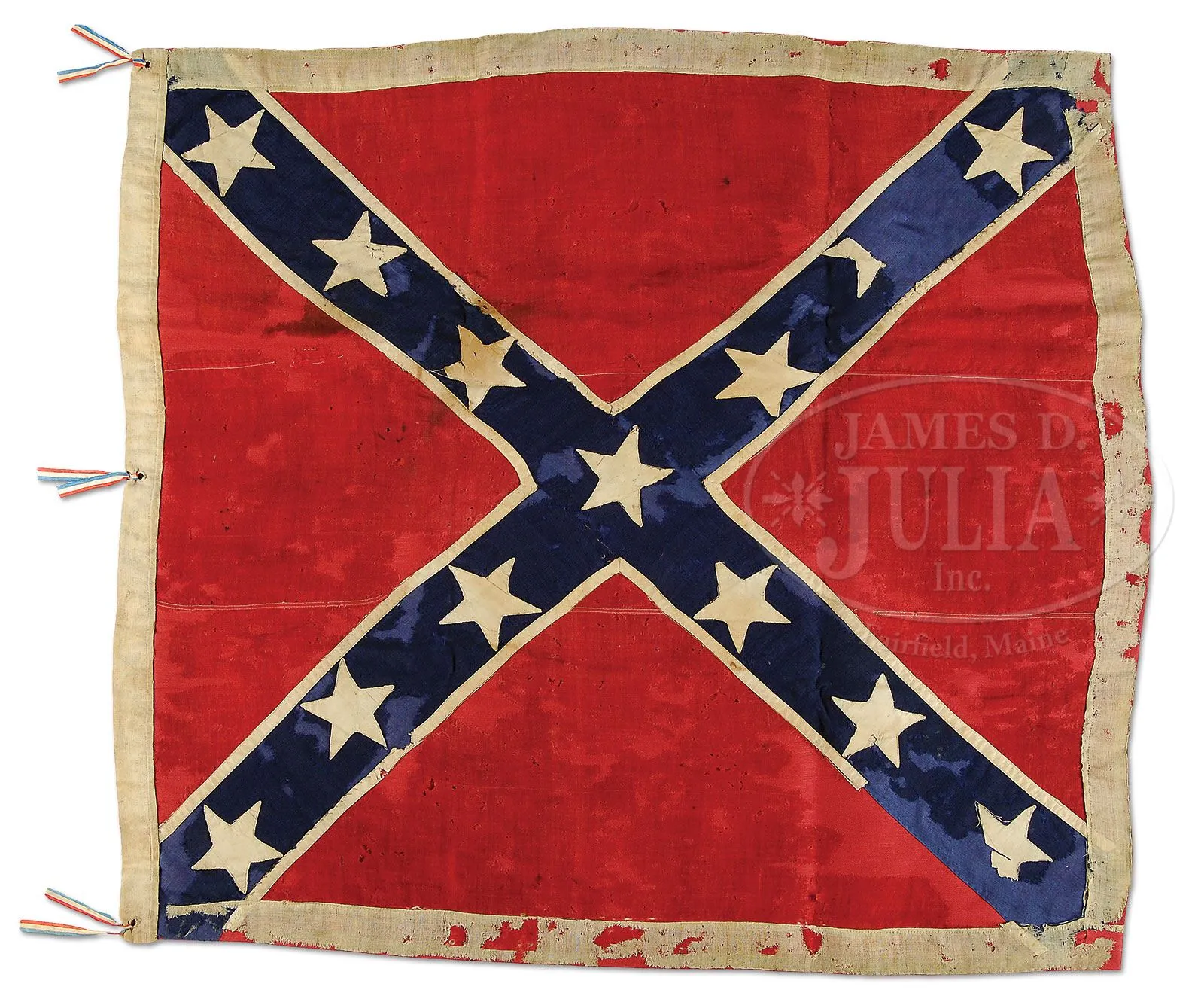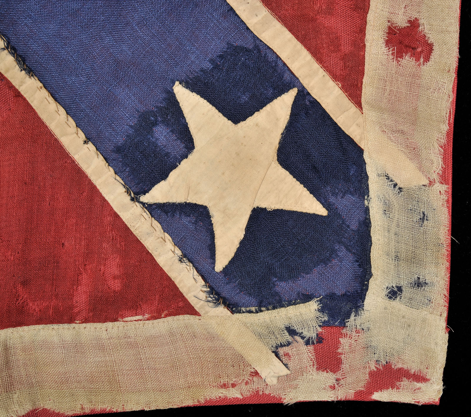 ANV BATTLE FLAG OF THE 9TH VIRGINIA CAVALRY. 50″ x 47″ wool bunting with cotton double applique 4 1/2″ stars. This flag is being offered through direct descent of the family of Walter Scott Callis, the last color bearer of the 9th Virginia Cavalry. Private Callis entered the war on May 6, 1861 and signed his oath of allegiance exactly 4 years later on May 6, 1865, near his home in Bowling Green, Virginia. Previously Callis had a gunshot wound in June of 1864 and was hospitalized at Chimborazo Hospital in Richmond, Virginia. Family history states that all babies born into color-bearer’s family after the war were wrapped in this flag at birth. This was done until about 1900 when the flag was put into shadow box with tobacco leaves to preserve it. This unit was a well-known fighting unit during the Civil War with a couple regimental histories written about it. This unit was involved in most battles of the Army of Northern Virginia (ANV), including Manassas, Peninsula Campaign, Seven Days Battles, Second Battle of Bull Run, Antietam, Fredericksburg, Chancellorsville, Brandy Station, Gettysburg, Bristow, Petersburg, 1864 Valley Campaign and the Appomattox Campaign where this 5th bunting issue battle flag was issued in September or October of 1864. 5th bunting ANV battle flags are quite rare and this is one of only a handful of that issue known. There is a report written by flag historian Greg Biggs that accompanies this flag available for prospective buyers. Identified ANV flags are extremely rare, privately held, this is a rare opportunity to obtain one through direct family descent. This flag has just been conserved and presents beautifully as can be seen in photographs here. This is the first identified ANV battle flag to come to auction in close to 20 years and there may not be another offered again. PROVENANCE: Walter Scott Callis, Company B, 9th Virginia Cavalry. Great, great, great grandchildren. CONDITION: Flag overall is very good as conserved. Flag has been archivally attached to a backing cloth utilizing tacking stitches. Conservators report is available for inspection with before and after photographs. Flag is mostly intact as can be seen in photographs though portions of two stars are missing as are portions of the wool bunting red quadrants and blue Saint Andrew’s cross. Total losses of bunting probably amount to 10 or 15%. Red and blue colors are quite vibrant with areas of soiling and staining from use. Hoist is complete with 3 red, white and blue silk ribbon ties. 8-76348 JS16 (60,000-100,000) Click here to read the conservation treatment