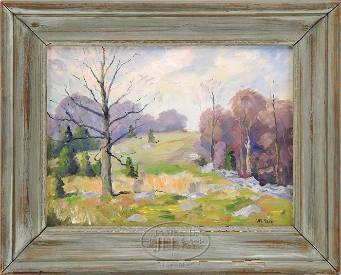 WALTER EMERSON BAUM (American, 1884-1956) COLORFUL LANDSCAPE. Oil on canvasboard scene shows a rock strewn hillside flanked by trees under colorful sky. Signed lower right “W. E. Baum”. Housed in a painted wood frame. SIZE: 12″ X 16″. CONDITION: Very good to excellent. 9-94715 (2,000-3,000)