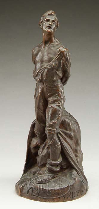 ALFRED F. NYGARD (Danish, 19th Century) THE DRAGON SLAYER. Bronze sculpture of a man holding by the neck a small winged dragon. Inscribed on base “Impression from the Sermon”. Also “1916” and “Yet by Dr. MS Rice DD”. Signed on reverse. On a rotating base. SIZE: 15-1/2” h. CONDITION: Very good. 9-70804 (1,400-1,800)