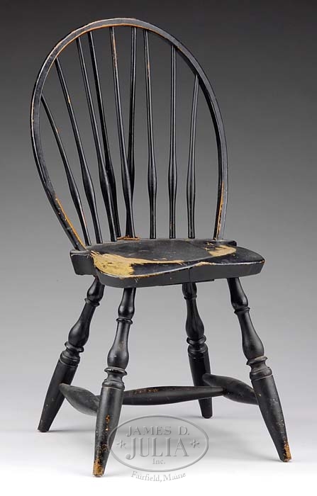 AMERICAN BRACE-BACK WINDSOR SIDE CHAIR IN BLACK PAINT. Circa 1780. The bowed back joined to eight swelled spindles, the pommel joined by two conforming spindles, the shaped and chamfered shield-form seat raised on swelled and turned cylindrical legs, joined by swelled H stretcher. SIZE: 36″ h. of back x 17-1/2″ h. of seat. CONDITION: Retains old black paint, seat altered from commode chair, now solid. 9-91722 (200-400)