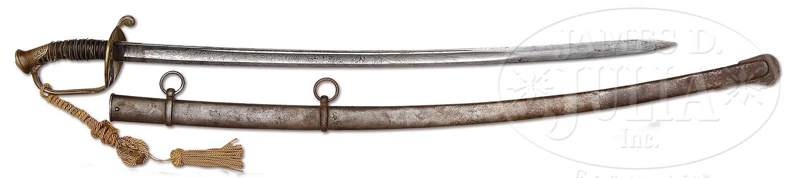 CONFEDERATE GENERAL LLOYD TILGHMAN’S SWORD BELT AND SWORD HE WAS WEARING WHEN HE WAS KILLED, LETTER TO CONFEDERATE PRESIDENT JEFFERSON DAVIS SIGNED “LLOYD TILGHMAN” AND TILGHMAN CDV. From direct family descent with affidavit attesting that the following described sword and sword belt were his when he was killed at the battle of Champion Hill on May 16, 1863. General Tilghman was a gallant soldier, he graduated from West Point in 1836, and saw American service in the Mexican war. He was in charge of the Kentucky State Guard at the beginning of the Civil War and his first Confederate command was with the 3rd Kentucky Infantry. He was promoted Brigadier General Oct 18, 1861, and over saw the construction of Fort Henry and Fort Donelson. He was captured after the fall of Fort Henry and sent to prison at Fort Warren. After being exchanged he assumed command of a brigade at the Vicksburg campaign, where at the battle of Champions Hill he was killed when struck in the chest by a fragment of a cannon ball. The sword here being offered is a Horstmann maker marked officer’s sword with a 30-1/2″ etched blade. There is a finely scratched description, as can be seen in photos, which reads in the fuller about 19″ from ricasso “WJM from Col. Tilghman Sep..18..” It almost appears when glinted properly in the light that this date on blade could read 1857, but it could read 1861, which both dates could make sense as Tilghman was in the Kentucky State Guards prior to the war (1857?) and he was a Col. in the Confederate Army in Sept. 1861. It is most unusual to see a 31″ sword blade stuck in a scabbard that will hold a 35″ blade, but that is what we have and there is no doubt this grouping has descended and displayed in family for over 100 years this way. The scabbard this sword is held is a scabbard for a cavalry saber with a contemporary orig inscription “SWORD WORN BY BRIG. GENL. LLOYD TILGHMAN C.S.A. WHEN KILLED IN BATTLE OF CHAMPIONS HILL MASS MAY 16, 1863” Obviously the inscription meant to read Champions Hill Miss. not Mass. The accompanying sword belt is unusual in that it is patent leather with a Model 1832 interlocking “US” enlisted sword belt plate, however this rig appears contemporary for its time of use. It is interesting to note that since the discovery of this sword and belt a full plate ambrotype of Gen. Tilghman has surfaced, taken by Rees of Richmond, VA circa early 1863 and Tilghman appears to be wearing this very belt and sword scabbard, however the sword is cavalry pattern which would be correct for this sword. However family history shows this configuration of foot officer’s sword in cavalry scabbard to have descended in family. After Gen Tilghman’s death, Gen. Grant signed and forwarded across enemy lines to Gen. Tilghman’s Adjutant an order authorizing the personal effects of Gen. Tilghman to travel safely through enemy lines to his family in Massachusetts (including the sword and flag of Gen. Tilghman). This orig order, along with Gen. Tilghman’s presentation sword, is on display in the Civil War Museum in Bardstown, KY. We can only speculate why a foot officer’s sword with a presentation from Tilghman is found in his cavalry scabbard. It would be interesting to research who “WJM” was, who Tilghman orig gave this sword and why he did not retain it. We are offering Tilghman’s sword belt and sword as descended in family. Also included in this lot is a signed, hand-written letter from Gen. Tilghman to Confederate President Jefferson Davis. This letter is 1-1/4 pgs, on 8.5″ x 11″ lined paper, dated October 21, 1862 and is addressed to “His Excellency Jefferson Davis”. The letter is regarding the appointment of his son as aide-de-camp. Of his son, Lloyd Tilghman, Jr., he says in part: “Though a youth of only seventeen, his gallantry in the attack on Clarksville by the troops under Command of Col. [illegible] of the Cavalry, which resulted in the Capture of that place, gives evidence of usefulness”. He continues with his recount of the completion of “the duties assigned me by the Sect. of War.” Heavy toning around the edges on both the recto and the verso, leaving a rectangular pattern in the middle. Additionally accompanied by a CDV of Tilghman in very good condition that was published by F. Anthony. PROVENANCE: Direct family descent. CONDITION: Sword and scabbard are overall very good. Inscription on sword blade and scabbard are easily discernible as can be seen in photos. Scabbard has several small dents, but is otherwise smooth with untouched patina, with scattered staining, rust and pitting. Sword blade has old sharpening, but is overall gray/bright. The inscription which reads “WJM from Col. Tilghman Sep.. 18..” is not easily discernible other than what is quoted here. Hilt is loose due to lack of protective washer. Finely twisted brass wire wrap is mostly intact, though loose and there is a copper wire repair as can be seen in photos. The Russian knot which has been utilized with a sewn hook to display the sword is sound. Brass exhibits mustard colored patina. Sword belt is complete and fairly sound with large areas of crazing and cracking over much of its surfaces. Both sword hangers are complete and intact, though the longer of the two has a contemporary repair to its last 8″ with no black finish like the rest of belt and hangers and is broken in 2 at the attachment buckle. Letter with heavy toning around the edges on both the recto and the verso, leaving a rectangular pattern in the middle. 4-47520 JS22 (22,000-30,000)