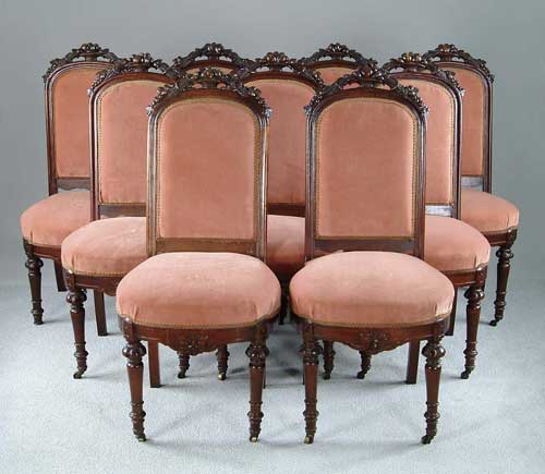OUTSTANDING SET OF NINE CARVED VICTORIAN DINING CHAIRS. Each side chair with rose upholstery with shaped seats and backs. The top crest carved with basket of fruit and grape clusters. Carved and turned front legs ending in caster feet. Nicely carved seat rail with outstretching back legs. PROVENANCE: Franzen/Cummings Estate, Bristol, ME. SIZE: 41” h x 18-1/2” seat h. CONDITION: Generally very good. Some minor old repairs. 9-98339 (1,000-2,000)