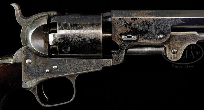 EXTREMELY RARE CASED ENGRAVED PAIR OF COLT MODEL 1851 LONDON NAVY PERCUSSION REVOLVERS. SN 23687 & 23647. Cal. 36. Identical pair with 7-1/2″ oct bbls, brass pin front sights and 1-line London addresses with arrows. Frames are identically engraved, probably by the same hand, with “Colts Patent” engraved in a ribbon on left side of frames. Frames are engraved in very well executed foliate arabesque patterns with shaded backgrounds and about 60-65% coverage. Engraving extends over bbl lugs, top side flats of bbl, around muzzles and on the rammer pivots. The silver plated large guard iron trigger guards & backstraps are identically engraved with matching patterns which extend over the buttstraps, toe of frontstraps & trigger bows. Each revolver is mounted with beautiful, highly figured, varnished walnut grip with respective matching SNs in backstrap channels. Sides of hammer spurs are also engraved and top edges of hammers are engraved in dolphin patterns. Cyls are usual 6-shots with Ormsby Naval Battle scene roll markings. Sides of bbl lugs and cyls have British proofs and revolvers have the typical English domed screws. All of SNs on the bottom of each revolver are accompanied by a small punch mark signifying extra polish for engraving or presentation. Accompanied by a beautiful brass bound, green baize lined mahogany casing with bull’s eye lifting ring in the lid, a mortised brass lock in bottom front with sliding latches on each end of the front. Inside the lid has the Colt “Directions for Loading Colt’s Pistols” label. Bottom is compartmented for the two revolvers, a Dixon Navy sized bag flask, two blued “COLTS PATENT” 2-cavity bullet & ball molds in the English style with locator pin in the left arm, two 500 count lacquered Eley cap tins, two L-shaped nipple wrench/screwdrivers, two all-metal cleaning rods and a Dixon pewter oil bottle. Right center covered compartment contains six spare nipples. Given the luxurious presentation dbl casing and fine engraving with deluxe burl walnut grips, it is readily apparent that this set was a presentation intended for a high ranking British officer or someone of equal importance. PROVENANCE: Dr. John & Margaret Pickup Collection. CONDITION: Revolvers are in nearly identical condition, all matching, showing very little evidence of ever having been used and are possibly unfired. #23647 bbl retains 93-95% glossy orig blue with light sharp edge wear and flaking on right side of bbl lug; rammer & handle retain about all of their orig case colors, brilliant on pivot; frame retains about all of its subtle English case colors, moderately faded on left side, brighter on right side and brilliant in sheltered areas; cyl retains 65-70% glossy orig blue with the losses flaked to a light patina; chambers retain about half their orig blue and all six safety pins are crisp; trigger guard retains about 65% orig silver with the front strap a gray/brown patina; backstrap is a silver/brown patina. Grip is sound with a couple of minor scratches and a few chips in the finish and overall retains about all of its bright orig varnish. Mechanics are crisp, brilliant shiny bore with a few small spots of pitting. #23687 bbl retains about 60% glossy orig blue with losses flaked, not worn, to a medium patina; rammer & handle retain about all of their strong case colors, faded on handle, brilliant on pivot; frame retains virtually all of its orig case colors, lightly to moderately faded; cyl retains 65-70% glossy orig blue with the flaked areas a light patina; chambers retain about half their orig blue and all six safety pins are crisp; trigger guard retains virtually all of its strong orig silver and backstrap about 60% silver. Grip is sound with a very few, very light nicks in the finish and overall retains about all of its brilliant orig varnish. Mechanics are crisp, brilliant shiny bore. Case is completely sound with usual handling & storage nicks & scratches with a couple of gouges in the lid and overall retains most of its orig varnish; interior is moderately faded inside the lid with yellowed label, missing a few small pieces; bottom is crisp & clean showing very little use; flask is crisp & new retaining all of its orig factory finish; molds appear to be unused with one showing some light flaking; nipple wrenches & cleaning rods are fine as are cap tins & oil bottle. Altogether this is an extraordinary set that would add to any collection. 4-46408 (75,000-125,000)