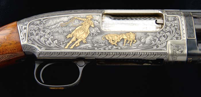 *CUSTOM GINO CARGNELL WINCHESTER MODEL 12 PUMP SHOTGUN. Cal. 20 ga. SN 1352780. Spectacular Model 12 with 26” factory vent rib bbl choked WS-1 with Bradley red ivory front bead and metal middle bead. Mounted with very highly figured, crotch cut, flame grain walnut with triple diamond checkered large forearm and checkered pistol grip stock, 14-1/2” over a solid red Winchester pad. Receiver is spectacularly engraved in Mr. Cargnell’s trademark style of phenomenal detail with large vignettes of three Indians on horseback rounding up and roping wild horses on left side. It has large raised gold figures of one Indian on horseback casting his lariat toward two raised gold horses. Background is desert scene with sandstone buttes. Right side depicts, in equally fantastic detail, three American cowboys and a herd of cattle with one of cowboys on horseback in raised gold about to cast his gold lariat at two raised gold steers, also set in a desert scene with sandstone buttes in background. This is all surrounded by extremely well executed foliate arabesque patterns with very fine punch dot backgrounds. Vignettes, top & front of receiver are outlined in gold wire. Takedown ring, both sides of bbl, bottom of magazine tube, magazine cap & around muzzle are engraved to match with gold wire borders on takedown ring, magazine cap and around muzzle. Triggerguard, also engraved to match, has an elliptical gold inlay with initials “JFN”. Serial numbers & takedown arrow are inlaid in gold and Mr. Cargnell’s signature is on bottom of receiver in front of loading port. Grip cap is stamped gold with a blank initial ribbon. Receiver is finished in the white. Gino Cargnell was a premier engraver in Belgium before emigrating to the U.S.A. at the encouragement of Angelo Bee, whose techniques & styles Mr. Cargnell assimilated into his already extensive talent. CONDITION: Extremely fine. Retains virtually all of its wonderful custom finish to both metal & wood. May have been fired, but if so, very little. Crisp mechanics, bright shiny bore. 4-30210 JR34 (3,000-5,000)