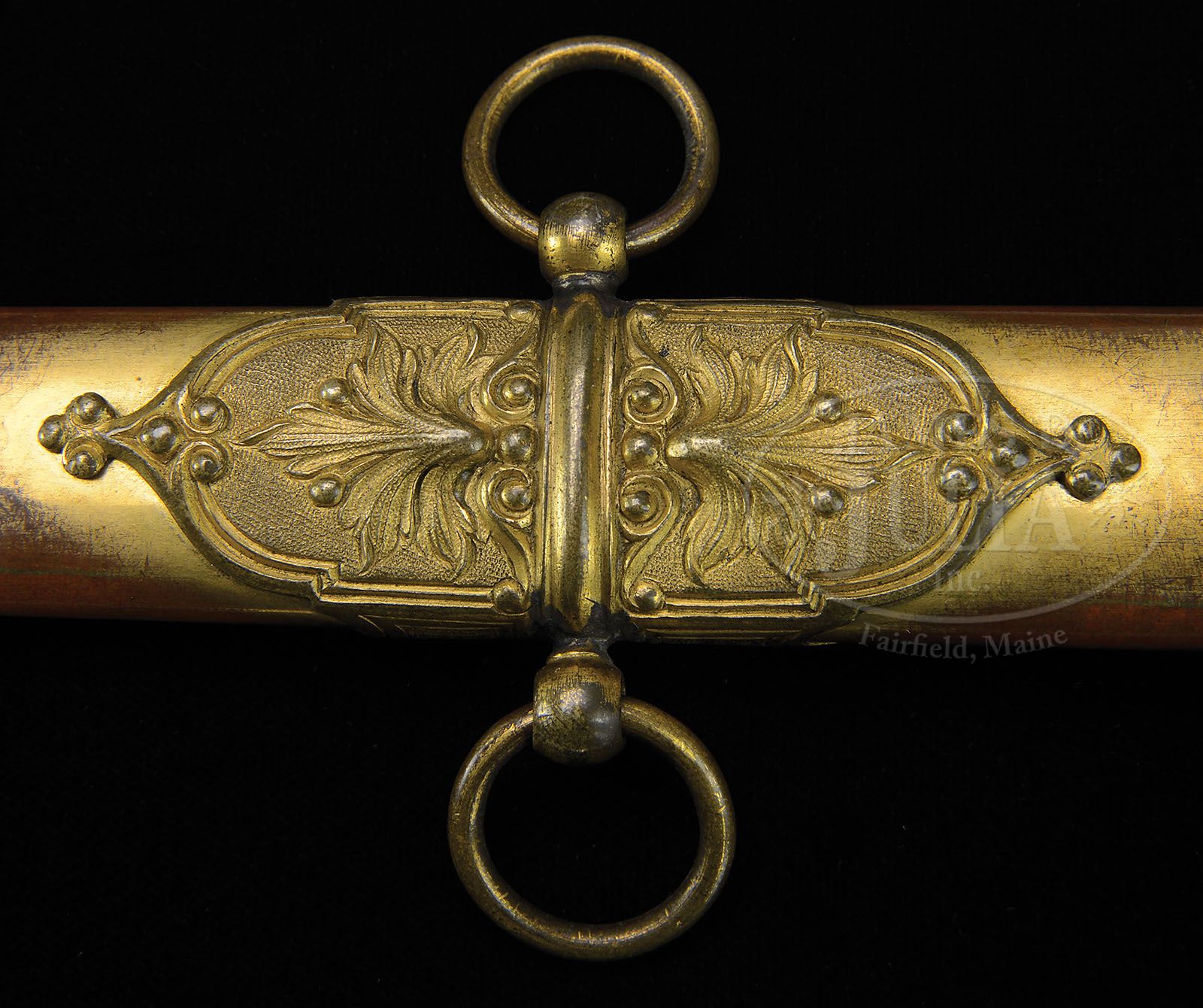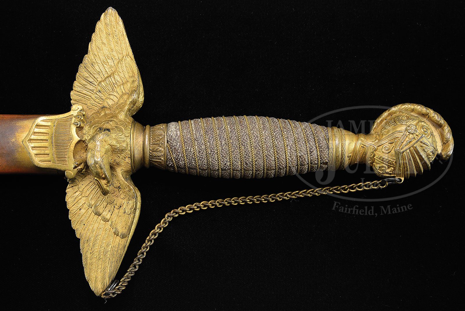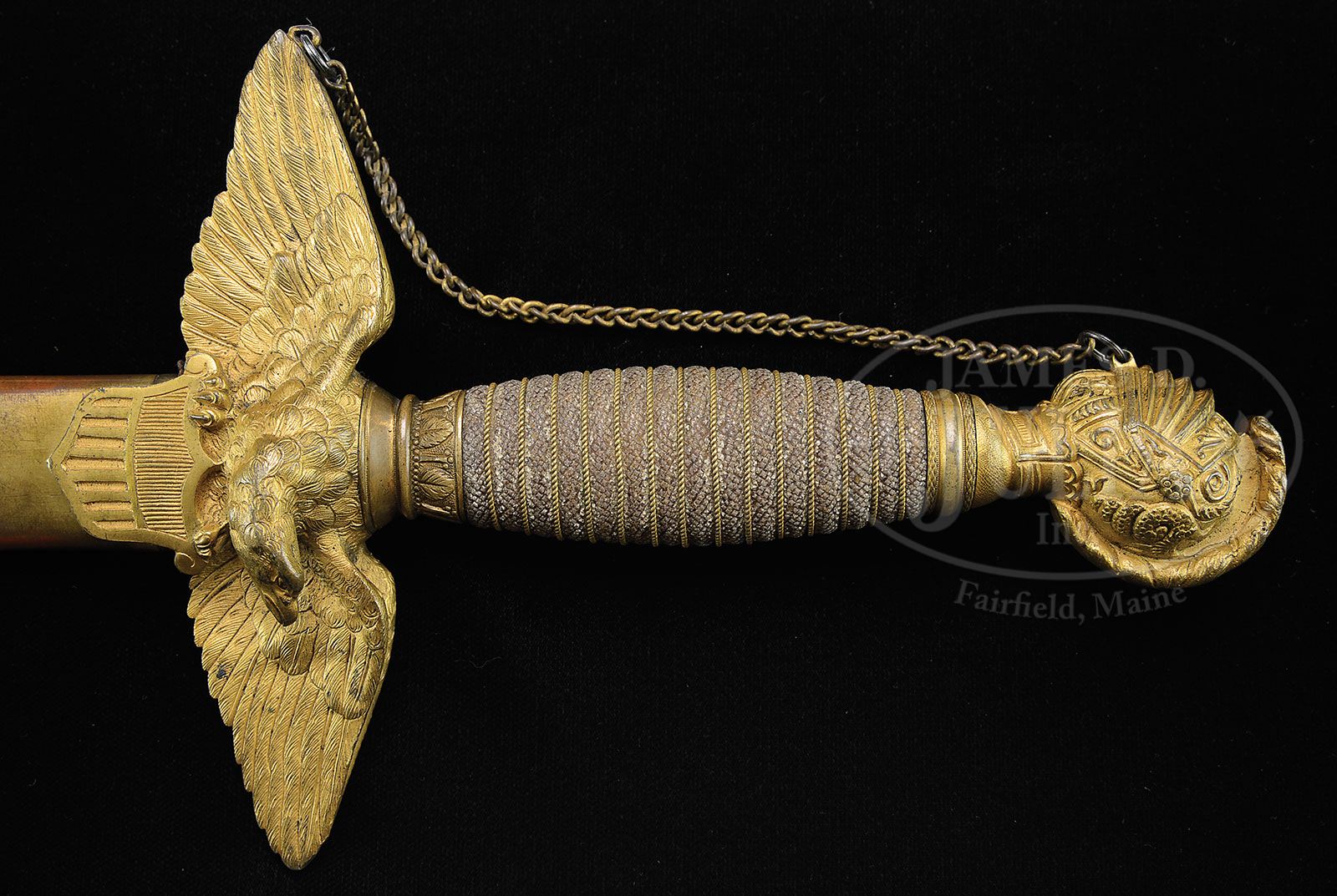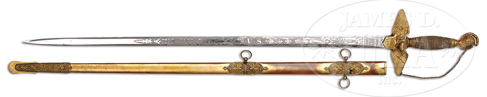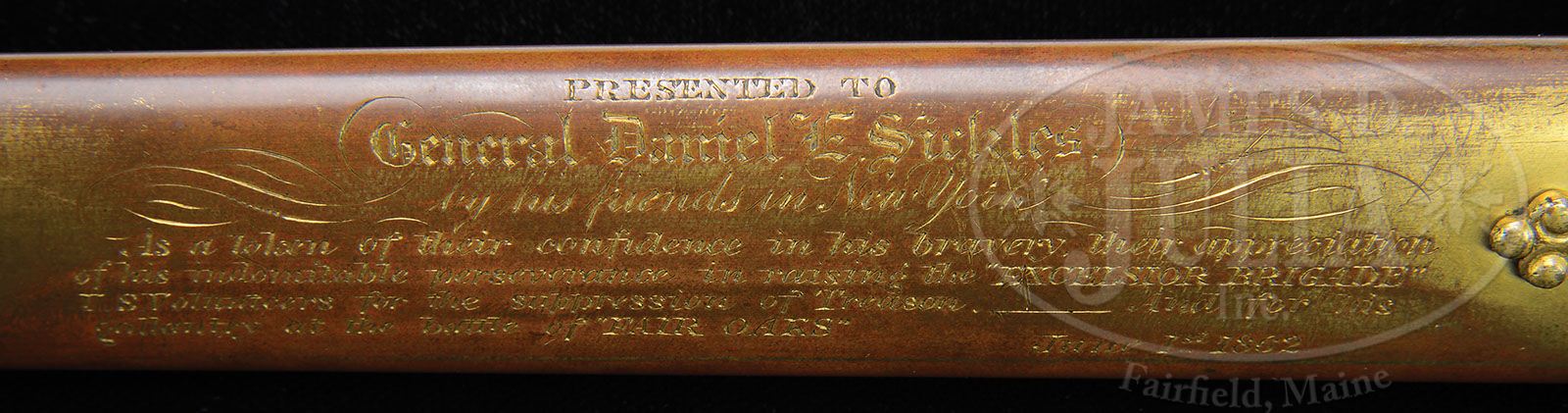 RARE AND HISTORIC TIFFANY PRESENTATION SWORD TO GETTYSBURG HERO AND MEDAL OF HONOR RECIPIENT GENERAL DANIEL SICKLES. Rarely are high grade presentation swords found that were presented to Medal of Honor winners prior to the event they won the award but Dan Sickles was already a celebrated soldier. This sword is in marvelous condition with a presentation that reads “Presented to Gen. Daniel E. Sickles. By his friends in New York. As a token of their confidence in his bravery, their appreciation of his indomitable perseverance in raising the “EXCELSIOR BRIGADE” U.S. Volunteers for the ‘Suppression of Treason’. And for his gallantry at the battle of “FAIR OAKS” June 1st 1862″. Sickles had a remarkable war time history, losing his leg at the battle of Gettysburg while disobeying orders and advancing his Corp to the “Peach Orchard” absorbing the full shock of Longstreet’s assault before it could reach the ridge which would most likely have broken the Union line and possibly changed the outcome of the most important Civil War battle that changed the course of the war and American history. During the height of the Confederate attack, Sickles fell victim to a cannonball that mangled his right leg. He was carried by a detail of soldiers to the shade of the Trostle farmhouse, where a saddle strap was applied as a tourniquet. He ordered his aide, Major Harry Tremain, “Tell General Birney he must take command.” As he was carried by stretcher to the III Corps hospital on the Taneytown Road, he bravely attempted to raise his soldiers’ spirits by grinning and puffing on a cigar along the way. His leg was amputated that afternoon. He insisted on being transported back to Washington, D.C., which he reached on July 4, 1863, bringing some of the first news of the great Union victory, and starting a public relations campaign to ensure his version of the battle prevailed. On the afternoon of July 5, President Lincoln and his son, Tad, visited General Sickles, as he was recovering in Washington. Sickles had recent knowledge of a new directive from the Army Surgeon General to collect and forward “specimens of morbid anatomy … together with projectiles and foreign bodies removed” to the newly founded Army Medical Museum in Washington, D.C. He preserved the bones from his leg and donated them to the museum in a small coffin-shaped box, along with a visiting card marked, “With the compliments of Major General D.E.S.” For several years thereafter, he reportedly visited the limb on the anniversary of the amputation. The museum, now known as the National Museum of Health and Medicine, features the artifact on display still today. Sickles was certainly one of the most famous of all Civil War Generals. His reputation was gained by both admiral accomplishments and controversial actions. There is much controversy even today in the numerous books written about the battle of Gettysburg, but Sickles was awarded the Medal of Honor for his actions on that infamous day in July of 1863. Sickles had a very colorful career prior to and after the Civil War. Sickles was the first man to ever be acquitted in American history of murder on the grounds of temporary insanity. Sickles then a Congressman shot down Phillip Barton Key, the son of Francis Scott Key, the composer of the “Star Spangled Banner”, in Lafayette Park across the street from Sickles home and the White House. Sickles had just discovered that his wife had been having an affair with Key and Sickles defense attorney Edwin Stanton (later Lincoln’s secretary of war) gained the innovative verdict. Sickles forgave his wife and the public who had applauded his role in the shooting were outraged at the forgiveness for his wife which ended his political career just as the Civil War began, starting a new career of soldier for Daniel Sickles. Sickles is sometimes called the “patron saint” of Gettysburg as he enacted Legislation in 1890 to make Gettysburg a national park. Accompanying this lot is about 100 page 19th century notebook and scrapbook of A.H. Van Deusen concerning the battlefield park that descended with the sword. The sword exhibits a 6″ spread eagle cross guard holding a shield with great detail of feathering gold-plated like is the full helmeted head that represents the pommel of this sword with rich detail including a dragon on either side of helmet. Solid brass scabbard has intricate floral decorated mounts also gold-plated in-suite to rest of sword. This is a fabulous sword in wonderful condition with a blade in mint condition with the highest grade of etching seen on Tiffany products. It has a 31″ dbl edged blade is white/bright with 22″ etched panels showing floral etched panels along with full standing soldiers of different eras including Roman soldier with short sword and shield, a Civil War soldier with sword and musket and a Revolutionary War era officer holding a raised sword with tint in background. Tiffany maker’s mark is shown on a placard below crossed American flags and a patriotic eagle holding a laurel wreath in its beak. CONDITION: Brass scabbard, cross guard and pommel retain about 90% of their original gold plate. The spiral cut shark skin grip is complete and intact with a small separation where pieced together complete with finely twisted gold plated wire wrap. This is a truly important and historic sword made by the most notable jeweler in North America during the 19th & 20th centuries. A great opportunity. 8-76367 JS21 (125,000-150,000)
