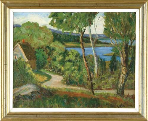 JOHN R. GRABACH (American, 1886-1981) LANDSCAPE WITH LAKE. Oil on board scene shows house with entry dirt road nestled amongst green trees overlooking blue lake. Purple hills in background. Housed in a gilt molded wood frame with white linen liner. Milch Galleries label affixed to back. Signed lower right “John R. Graba_ _ 1934”. PROVENANCE: Sotheby’s Lot 282 9/25/92. SIZE: 15-3/4” x 20. CONDITION: Minor inpainting to left corner, small cut to right corner. Otherwise very good. 9-97420 (1,200-1,800)