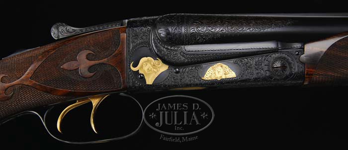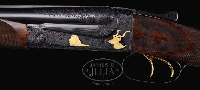 *UNIQUE EXHIBITION CSM MODEL 21 DOUBLE RIFLE. SN WR38513. Cal. 405 WIN. 24″ bbls, front ramp with fine bead front sight, hand filed 1/4 rib with two leaf express sight, 3″ wedge with scroll engraving over each chamber, left bbl marked “Model 21 – CSM / Trademark – .405 WIN”. The reinforced receiver, with added breech face fastener, is fully engraved with superb foliate arabesque scroll with stippled background, oak leaves with stippled background across fences, left side of receiver having gold kudo and gold majestic male lion. Right side with gold buffalo and gold leopard. Bottom of trigger plate with gold rino and gold cheetah on trigger guard. Consignor states he commissioned Geoffrey Gournet to execute the outstanding gold animals found on this gun. Mounted with exhibition flame grade walnut, fleur de lis carved and checkered pistol grip with scroll engraved sculpted steel grip cap, leather covered pad, gold initial oval, fleur de lis carved and checkered beavertail forend with ebony insert tip. Accompanied with factory oak and leather case with label and accessories, brass corners and brown canvas cover with leather corners. Also included are two unopened boxes of Superior ammo, and a full open box, all marked January 30, 08, and a partial box of seven marked to Connecticut Shotguns February 28, 06. It should be noted that 21 Double Rifles, other than 22 cal, are no longer found in the CSM Catalog, believed to be prohibitively expensive to build. CONDITION: Extremely fine. Appears as new since completion. Metal surfaces retain virtually all of their fine original blue with stock and forend having only minor handling marks and retaining virtually all of their fine original finish. Mechanics are crisp with non-automatic safety, strong ejectors, and bright shiny bores. Gun is probably unfired since completion and a little stiff to open and close. 4-35773 BDT173 (50,000-60,000)