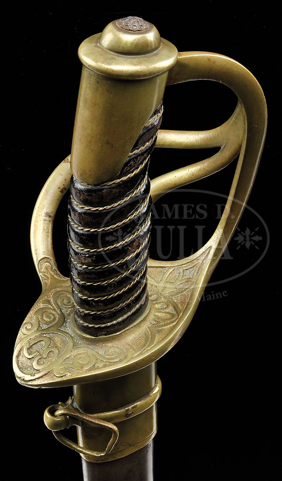 Please Note: We have received information that the sword was a war trophy brought home by a Capt. William H. Mickle of the 134th NY Volunteer Infantry, probably captured after the fall of Atlanta. VERY RARE LEECH & RIGDON CAVALRY OFFICERS SABER. This is among the rarest and most desirable patterns of Confederate Cavalry Officers sabers known. This example is the best that has ever come to market and probably the finest example known. There are less then 10 examples known, most in museum collections and only 3 or 4 in private hands. This sword orig sold at Cowan Auctions for over 80,000 (May 4, 2002) and is later found in the Gary Hendershot Catalog priced at 95,000. This example is in beautiful condition, retaining one of the finest etched blades found on any Confederate Officer’s sword. This sword also shows an unusual feature of having the blade tang where it is peened over on top of pommel cap, engraved and chased, which is a very rare feature; possibly associated with Jacob Faser, who decorated swords for Leech & Rigdon and earlier for James Conning in Mobile ALA. This feature is seen on very few swords one famous example being the Conning Staff sword carried by Confederate General Leonidis Polk. This pattern really has the look and flair to be carried by the most important officers. The decorated hilt terminates at the quillion with a 1″ inch oval with a large “CS”. PROVENANCE: Steven Hess Collection. CONDITION: 32 1/2″ slightly curved blade is more reminiscent of a Staff Officers blade. However, it’s quite massive measuring 3/8″ thick at ricasso and almost 1 1/4″ wide. 18″ etched panels are crisp and distinct with scattered areas of staining, pitting and rust. Etched panels include a large 2″ Old English “CS”, floral motifs and panoplies of arms. The hilt retains traces of gold in protected areas. The leather grip is intact with most of its orig black polish with areas of scuffing and wear at high areas. The twisted brass wire wrap is complete and intact. Protective washer is missing causing hilt to be slightly loose. Scabbard is sound and solid and cleaned overall. Screw is missing from drag. Top saber ring is bent and worn and bottom saber ring is of a smaller diameter, unsoldered and probably replaced. 8-76364 JS4 (45,000-65,000)