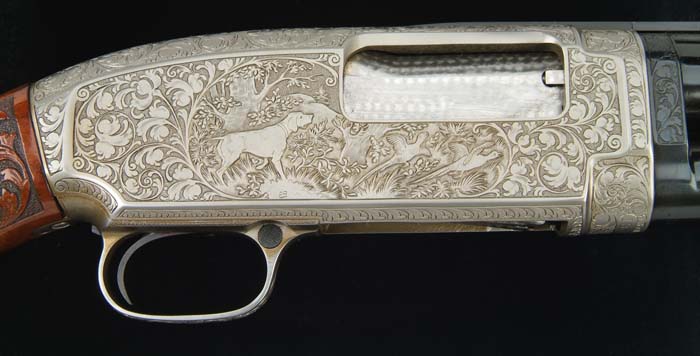 *ENGRAVED WINCHESTER MODEL 12 DELUXE SKEET GUN. Cal. 12 ga. SN 1582410. Beautifully engraved Model 12 with 26” Simmons vent rib bbl with Bradley red ivory front bead & white ivory middle bead choked WS-1. Mounted with spectacular, flame grain, deluxe, checkered & carved American walnut with large rnd forearm & pistol grip stock with carved ivory grip cap, 14-1/8” over a Winchester hard rubber buttplate with thin white spacer. Receiver is coin finished and engraved with large vignettes of a hawk & three ducks in a marsh scene on left side and a bird dog with two pheasants in a field scene on right side, all surrounded by full coverage foliate arabesque patterns. Triggerguard & takedown ring are engraved to match. Both vignettes are signed “EB”. Bore diameter: .742. Bore restrictions: .002. Drop at heel: 2-1/2”, drop at comb: 1-1/2”. Weight: 8 lbs. CONDITION: Very fine. Retains virtually all of its beautiful custom finish to both metal & wood. Wood is sound with a minor nick or two in varnish and one small spot of crazing on forearm. Mechanics are crisp, bright shiny bore. 4-30391 JR259 (4,000-6,000)