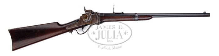 SHARPS NEW MODEL 1863 CONVERSION CARBINE SN C22273. Cal. 50-70. Standard conversion carbine with 22” rnd bbl, square base front sight with German silver blade & Lawrence Patent ladder rear sight. It has light standard markings on bbl, receiver & lockplate. Bore has orig 6-groove rifling. It has factory replacement, nicely figured, uncheckered American walnut with std forearm & replacement buttstock with cartouche in a small ribbon on left side. It has a sling bar & ring on left side of wrist. CONDITION: Fine. Bbl retains blue in very sheltered areas and around front sight, being mostly a dark plum-blue patina with light, fine surface rust. Receiver & lockplate retain 50-60% faded case colors with balance a brownish patina. Wood is sound with minor chips behind sling bar and usual nicks, dings & scratches and retains a hand worn patina that will clean much better. Mechanics are crisp, bright shiny bore with scattered fine pitting. 4-32604 JR510 (2,000-3,000)
