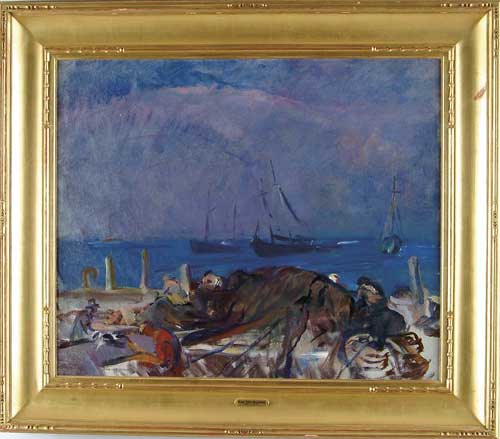 ALICE KENT STODDARD (American, 1885-1976) “LOBSTER BOATS AT NIGHT-MONHEGAN”. Oil on canvas scene shows three sailboats off docks with people mending nets. Wonderful deep blue colors and colorful figures. Estate stamped signature to front left. Housed in an outstanding arts and crafts style carved gilt wide frame. Back has label from David David Art Gallery, Philadelphia “Estate of A. K. Stoddard”. Also two Christies auction labels. SIZE: 25” x 30”. CONDITION: Relined, inpainted. Very good. 9-98890 (4,000-6,000)