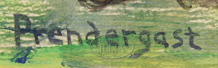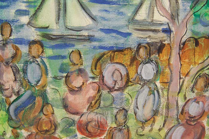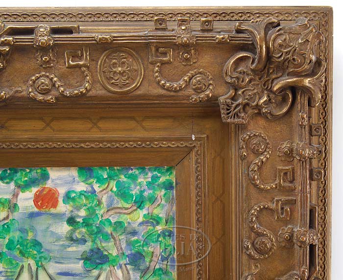MAURICE BRAZIL PRENDERGAST (American, 1858-1924) SUNDAY AFTERNOON. Mixed media (watercolor, gouache) on paper scene shows thirteen figures in an ocean front park area overlooking water with two sailboats and red sun. Three trees frame with scene with shoreline rock ledge. Probably a North Shore, Massachusetts scene. Signed lower right “Prendergast”. Housed in a magnificent gesso decorated gilt frame with title and artist plaque. SIZE: Sight: 14-3/4″ x 19-3/4″. CONDITION: Very good. 9-95432 (30,000-50,000)