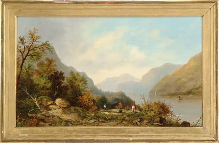 R. WENTWORTH (American, 19th Century) PICNICKING ON THE HUDSON. Oil on canvas scene shows a large body of water surrounded by tall mountains. A river sidewheeler and several sails are seen on tranquil water. Foreground has three figures looking out over view. Signed lower left “R. Wentworth 1874”. Housed in its original gilt liner. SIZE: 18” x 30”. CONDITION: Very good having two old patches to reverse with corresponding inpainting and spot inpainting. 9-72674 (10,000-15,000)