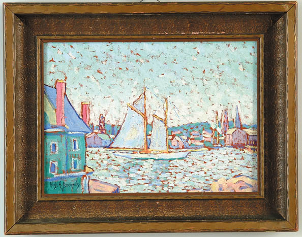 HUGH H. BRECKENRIDGE (American, 1870-1937) SUMMER SAILING. Double sided oil on board shows impressionistic view of two-mast schooner sailing through harbor with building in left foreground and buildings and hills in background. Signed lower left “Hugh H Breckenridge”. A very colorful painting. Other side has vertical scene in an abstract form of a steamship and sailboat along coast with many buildings and very tall mountains. This side is unsigned. Housed in a period bronze gilt wood frame. SIZE: 10” x 14”. CONDITION: Very good. 9-95493 (4,000-6,000)