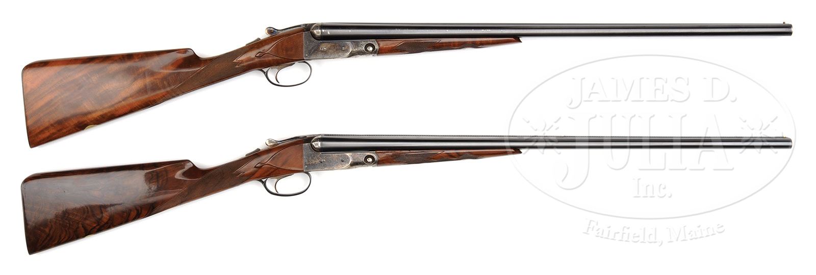*BRACE OF SMALL BORE DHE PARKER REPRODUCTIONS WITH CASES. SN 20-02594/ 28-00464. Cal. 20 ga. and 28 ga. Both guns have 26″ bbls with standard markings on bbls. Both guns have straight grip buttstocks with splinter forends, skeleton buttplates, and gold ovals on toe lines. Wood of 20 ga. is lightly figured and with slightly contrasting streaking. Wood of 28 ga. is superb, flame crotch figure, wonderfully marbled. (One of the best pieces of wood on a DHE that this cataloger has ever seen.) 20 ga. 0 Frame. Bore diameter: left-.617, right -.617. Bore restrictions: left -.015 (Mod), right -.007 (IC). Wall thickness: left -.033, right -.030. Drop at heel: 2-1/16″, drop at comb: 1-3/8″. Weight: 6 lbs. 12 oz. LOP: 14-1/4″. Typical Parker Reproduction case with canvas outer cover, is lined in green felt with Parker Reproduction label, and contains a pair of snap caps. CONDITION: Very fine to excellent. Bbls retain most of their orig blue with considerable marks and rubs on sides of both bbls toward breech ends. Action retains approx 80% color, considerably silvered on bottom, fences, and forend latch. Wood has a fair number of minor marks, rubs and scratches associated with light field use. Bore is excellent. Breech ends of bbls have some discoloration. Action is tight. Ejectors are in time. Trigger works. Case is excellent. 28 ga. 00 Frame. “F”. Bore diameter: left-.552, right -.552. Bore restrictions: left -.027 (Full), right -.010 (IC). Wall thickness: left -.022, right -.022. Drop at heel: 2-3/16″, drop at comb: 1-3/8″. Weight: 5 lbs. 10 oz. LOP: 14-1/4″. Typical leather case with canvas outer cover, is lined in olive green felt, and contains a pair of snap caps and two keys. CONDITION: Excellent. Bbls retain essentially all their orig blue with one or two light marks. Action retains approx 85 – 90% orig color, silvered at normal wear points. Wood has a few minor marks, and a couple of deeper pings, two fairly deep toward tip of forend. Mechanically crisp. Case is very fine. Some interior blocking has loosened. CONDITION: As above. 4-49281, 49286 MGM98 (5,000-8,000)