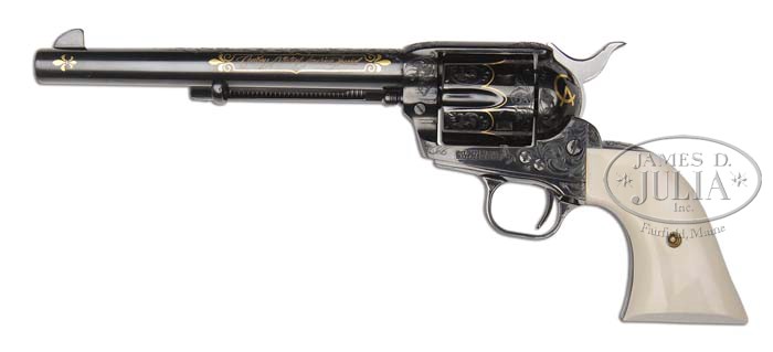 *COLT SINGLE ACTION ARMY COWBOY ARTISTS OF AMERICA SPECIAL. SN CAA-6. Cal. 45 Colt. Royal blue finish with 7-1/2″ bbl, full front sight and 1-line block letter address. Left side of frame has 2-line 3-patent dates and rampant Colt. Mounted with 2-pc smooth ivory grips numbered to this revolver. Left side of bbl has a gold inlaid panel with fleur-de-lis at each end and inlaid in gold in the center “Cowboy Artists of America Special”. There is an additional gold fleur-de-lis at left side of muzzle. The left recoil shield is inlaid with the intertwined gold initials “CA” and right side of frame, below cyl opening is inlaid in gold “1 of 250”. SN is also inlaid in gold. Revolver is very nicely engraved with about 40% coverage fine foliate arabesque patterns which extend over the top strap and up the bbl terminating above the address with an additional pattern on right side of muzzle. Back strap, butt strap & trigger guard are engraved to match. Ejector rod housing is also engraved to match on outer radius and in top gullet. Cyl has matching patterns on lands between the flutes and in a continuous flowing band around rear edge. Center of cyl is inlaid with a continuous fine gold band that scallops around flutes and around engraving on lands. SN was observed on bottom of frame with an assembly number or alternate SN “AO7871” on left side of front & back straps under grip. “7871” is stamped around the cyl bushing hole on bottom of bbl under ejector rod housing and inside radius of ejector rod housing. Accompanied by its orig gold velvet lined custom shop walnut casing with Colt medallion in right front corner and a mortised brass lock in front. Accompanied by a Colt factory letter identifying this revolver in caliber 45 Colt, 7-1/2″ bbl, blue finish with 2-pc ivory stocks without medallions and factory engraved “See Remarks for details”. The engraving vendor is listed as “R.L. Wilson Co. / Hadlyme, Connecticut”. It also lists a presentation case French fitted with gold colored interior and shipped to B.E. Hodgdon, Inc., Shawnee Mission, KS, with date of shipment unavailable and Colt Custom Shop Order #1225. Remarks section details all of the gold work as described above. Also accompanied by a notarized statement dated Aug. 23, 2010, from Robert Carradine, brother of David Carradine, certifying that “This Colt Single Action Army, serial number CAA6 is The Cowboy Artists of America Special Edition. David was an artist and a cowboy and this fine cased Colt came to him while he was filming the History Channel Series, ‘Wild West Tech’. (Colt letter included). PROVENANCE: From the private collection of the late actor, David Carradine. CONDITION: New, unfired. Box has a few handling & storage nicks & scratches and retains most of its orig factory varnish. Interior is crisp & clean. 4-40808 JR261 (3,500-5,500)