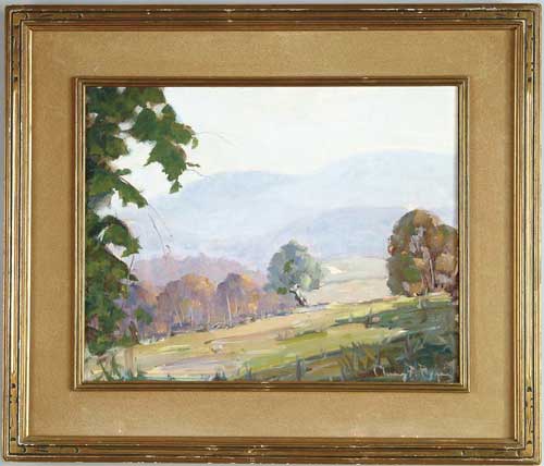 CHAUNCEY FOSTER RYDER (American, 1868-1949) MISTY MORNING. Oil on board scene shows summer hillside with trees and grass looking over to light blue hills and mountain. Signed lower right “Chauncey F. Ryder”. Paper title on back. Housed in a fine period wide gilt arts and crafts style frame. SIZE: 16” x 20”. CONDITION: Very good. 9-99674 (6,000-8,000)
