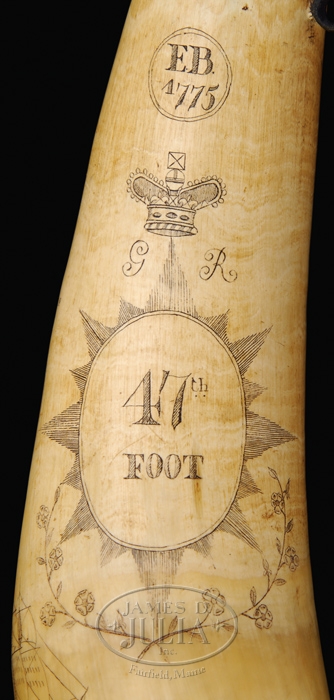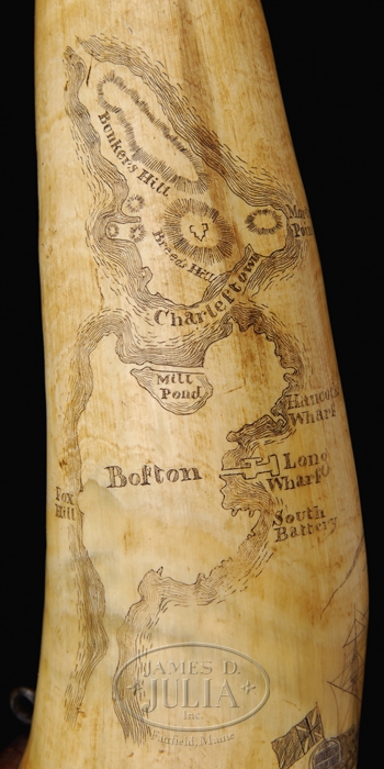 SUPERB SCRIMSHAWED REVOLUTIONARY-ERA BRITISH BOSTON AREA MAP POWDERHORN. This magnificent, artistically-rendered scrim horn is extremely well-rendered. One side with a wreath bearing the inscription “E.B. 1775” above a crown which has the initials “GR” beneath it. An escutcheon at the base with a sprig of flowers beneath it has inscribed in the center “47th FOOT”. To the left, a highly detailed British Man Of War. On the reverse side of the horn, a detailed map of Boston, Charlestown, Breeds Hill, and Bunker Hill. Along the curve, an inscription in panel which reads “A POX ON REBELS AND THER CRYMES”. Base of horn with inverted wood disk, having a removable screw knob. A beautiful and decorative Revolutionary-era powderhorn. CONDITION: Wonderful toned patina. Generally excellent condition. 4-.31625 JJ54 (2,500-3,500)