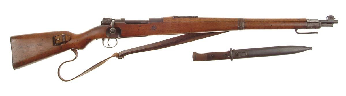 *ERFURT KAR98 W/BAYONET & SLING. SN 7010ff. Cal. 8 mm.. 24” rnd bbl. Dated 1916 & 1920 over the chamber, 1920 only on the stock. The bayonet is marked “S/239” on the left ricasso of the 10” single fuller blade. The SN 4109 does not match any of the numbers on the scabbard. The sling is not marked. CONDITION: 40% blue mixed with surface rust and light pitting. Wood shows heavy wear and oil stains at the wrist and comb. Action is fine. Bore is bright but lightly pitted. From the Collection of the late Barney Frost. 4-53555-89 FS267 (400-650)