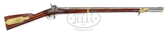 FINE WHITNEY MODEL 1841 MISSISSIPPI RIFLE SN NSN. Cal. 54. One of the more beautiful rifle muskets made, these fine rifles have 33” rnd bbl, tiny brass front sight with no provision for a bayonet. It has fixed rear sight and is mounted in 1-pc uncheckered American walnut stock with brass furniture and a brass tipped ramrod. Lockplate has usual markings with date “1851” which date is also on top tang. Left side panel of stock has two legible cartouches. Right side of butt has a large 2-pc brass patchbox that contains a spare nipple & musket tool. They were produced in period 1843-1855 in fairly large quantities and saw use throughout Civil War. CONDITION: Very good. Bbl retains a mottled silver/brown patina with scattered fine pitting. Lockplate & hammer retain traces of orig case colors being mostly a mottled silver/brown patina. Stock has a couple of small chips in front of lockplate and back of top tang, otherwise wood is sound with nicks, dings & scratches and retains a fine hand worn patina. Mechanics are fine, strong bright bore with pitting in grooves, may clean a lot better. 4-59698 JR535 (2,000-3,000)