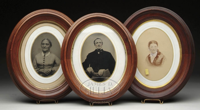 LOT OF SIX OVAL WALNUT ANTIQUE FRAMES. Two have tintypes of elderly people, two have photographs of children, one has a label “H. P. Moore, Concord, New Hampshire”. SIZE: Outside dimensions range from 12” x 10” to 13” x 10-3/4”. CONDITION: Generally good. 9-29055 (250-400)