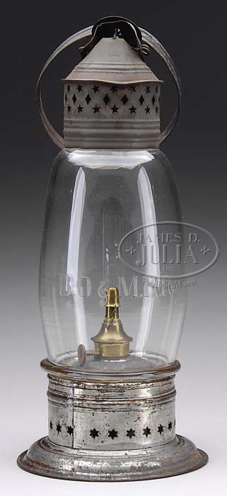 EARLY B.O. & M.R.R. LANTERN. Interesting style lantern on tin pedestal base pierced with a string of stars below etched globe and similar style top. SIZE: 13″ h. CONDITION: Overall very good. Oxidation and denting to tin components, possibly early silver repaint to base and hanger is loose. Globe appears to be free of damage. 1-9046 (400-600) Auction: Advertising, Toy & Doll - Spring 2009 Please Note: All prices include the hammer price plus the buyer’s premium, which is paid by the buyer as part of the purchase price. The prices noted here after the auction are considered unofficial and do not become official until after the 46th day. |