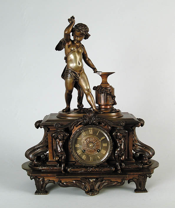 FINE ALL BRONZE FIGURAL MANTLE CLOCK. Dial signed “Bigelow Brothers & Kennard, Boston”. Clock has 10” figure of a cupid with hammer in hand working on an arrow on a large anvil on pedestal. His bow and arrows are under feet. The front have two putti flanking dial. Leaf decoration throughout resting on six decorative feet. Pendulum and key present. Strike at hour and half hour. SIZE: 17-1/2” h x 14” w. CONDITION: Very good. Working. 9-95722 (1,200-1,500)