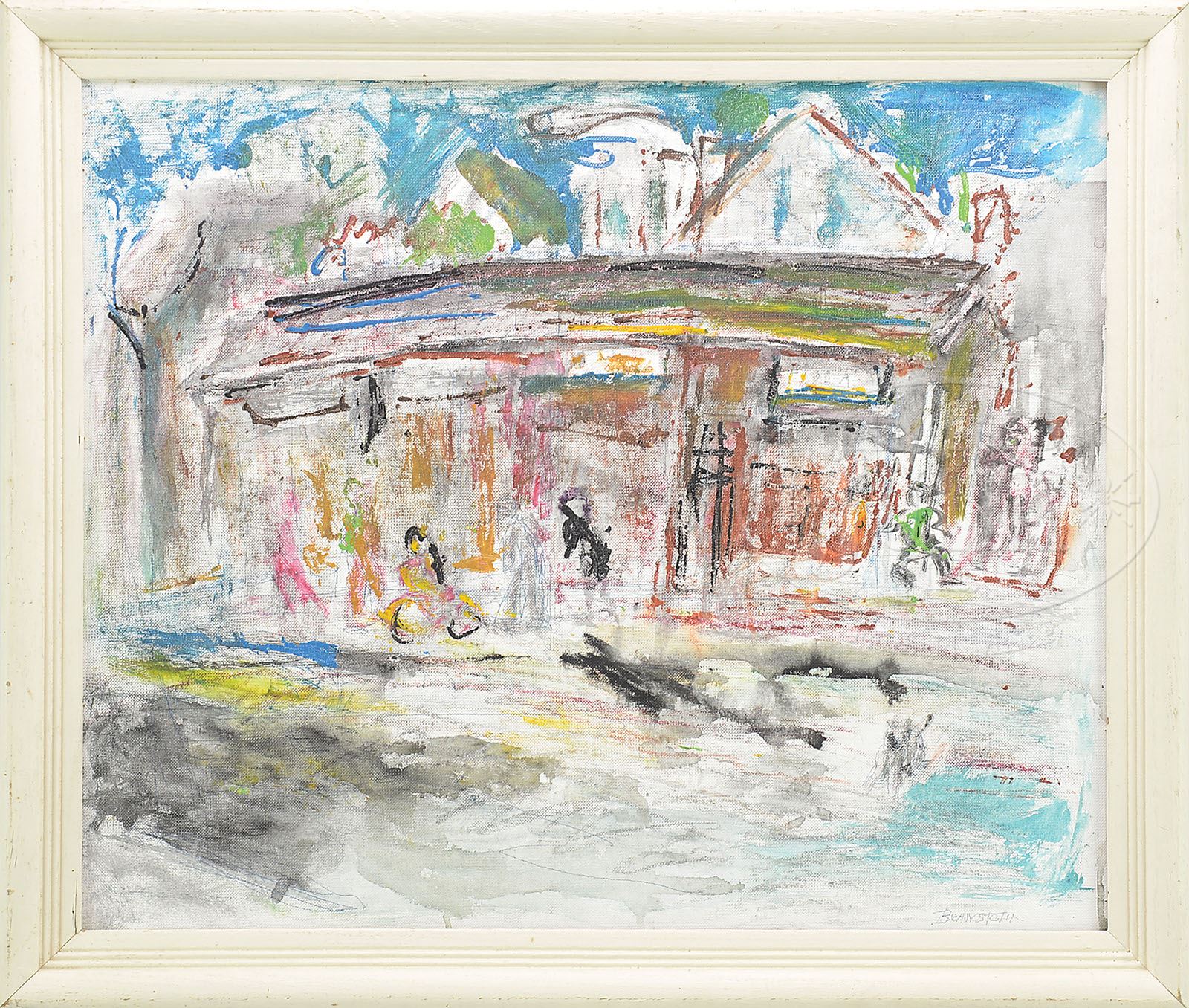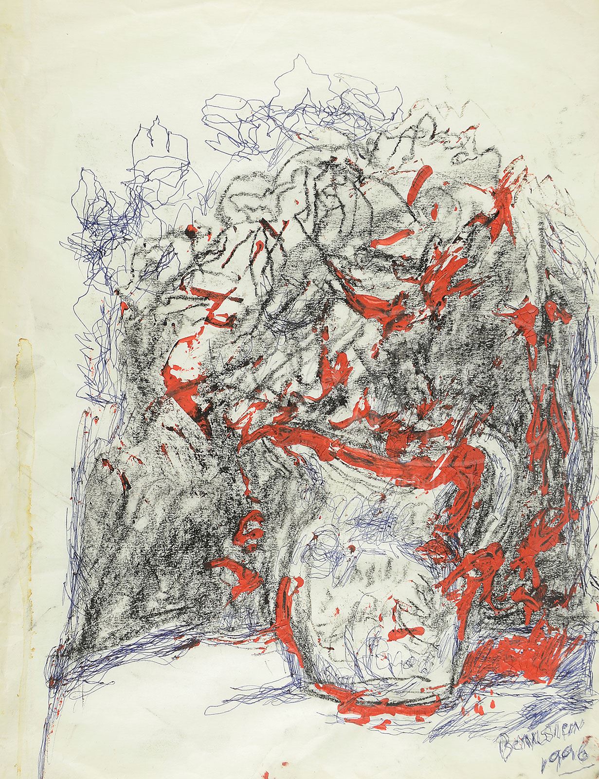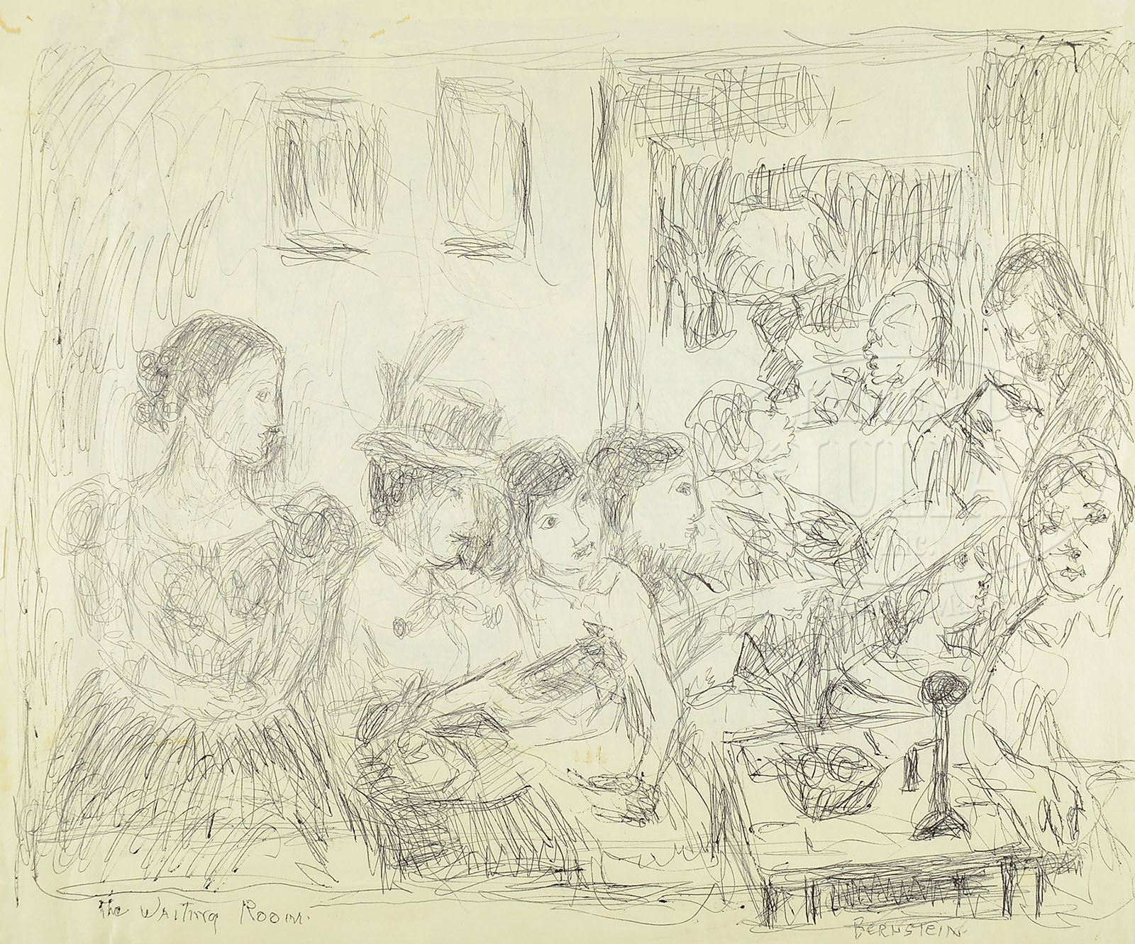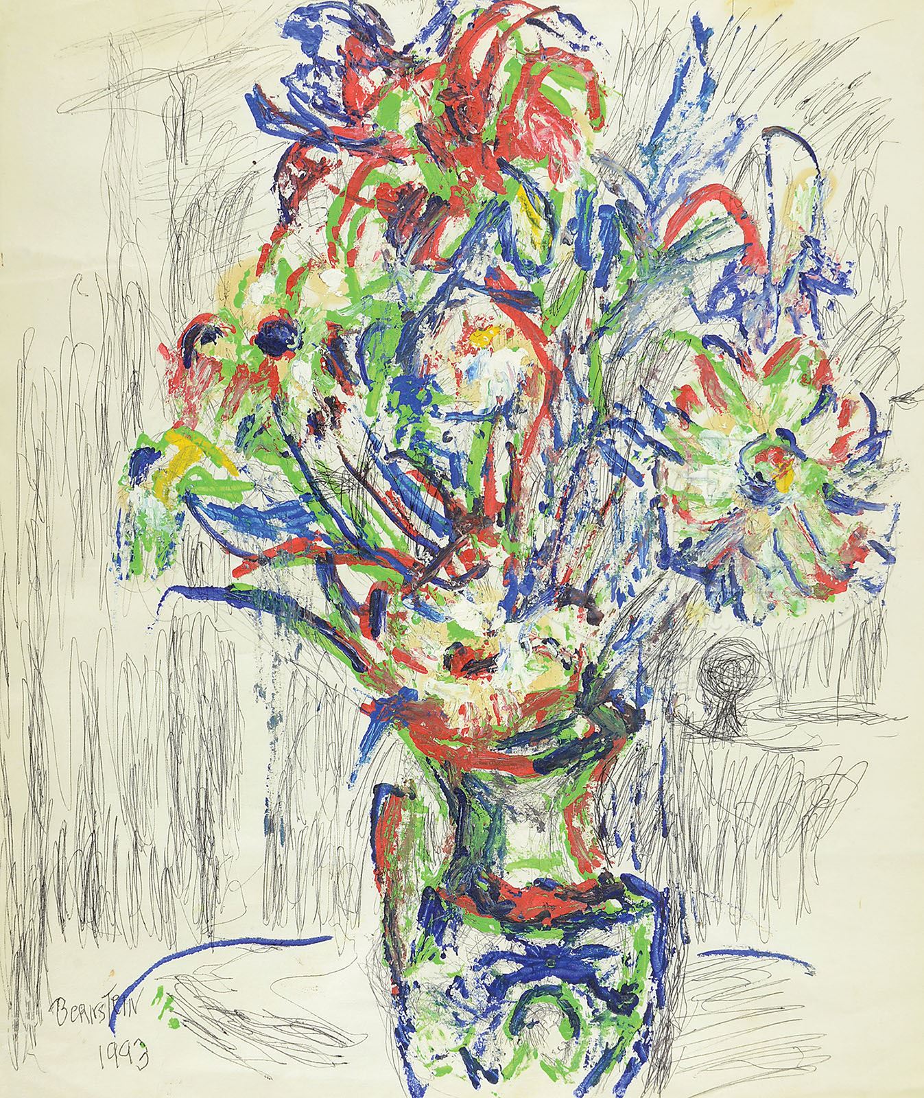 THERESA BERNSTEIN (American, 1890-2002) SIX WORKS. 1) “Pizza Joint” dated “6/88”; Oil on canvas board; signed “Bernstein”, lower right; framed. 2) “The Waiting Room”/”The Potato Eaters” (2-sided); Ink on paper; signed “Bernstein”, lower right; unframed. 3) Untitled – Still life of flowers; Watercolor on paper; signed “Bernstein 1994”, lower left; unframed. 4) Untitled – Still life of flowers; Ink and gouache on paper; signed “Bernstein 1993”, lower left; unframed. 5) Untitled – Still life with pitcher; Ink, charcoal, and gouache on paper; signed “Bernstein 1996”, lower right; unframed. 6) Untitled – Still life of flowers; Gouache and ink on paper; signed “Bernstein 1997″, lower right; unframed. Note: accompanying lot is a exhibition poster signed by the artist. SIZE: 1) Sight: 20″ x 24″ Overall: 23″ x 27″. 2) 14″ x 17″. 3) 20″ x 15″. 4) 16-1/2″ x 14″. 5) 20″ x 15”. 6) 17″ x 14″ CONDITION: As found: with stains and paper folds 9-28454 (700-900)