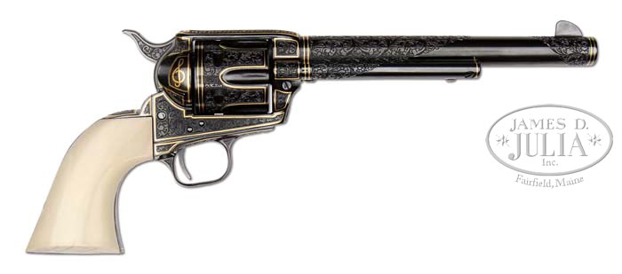 *CASED KEN WARREN ENGRAVED & GOLD INLAID COLT 3RD GENERATION SINGLE ACTION ARMY REVOLVER REX ALLEN TRIBUTE. SN 87423SA. Cal. 45 Colt. All blue finish with 7-1/2″ bbl, full front sight, 1-line block letter address with model & caliber markings on left side. Left side of frame has 2-line 3-patent dates and the rampant Colt. Mounted with fine custom 1-pc ivory grip with carved diamond brand at top left side. Revolver is engraved in foliate arabesque patterns with fine shaded background and about full coverage on frame & outer diameter of cylinder. Engraving extends over the bbl and terminates about 1″ in front of the address with another band of engraving around front sight. Top of the back strap is engraved with the intertwined initials “RA” and a fine shaded background. Butt strap & trigger plate are engraved in foliate arabesque patterns. Back strap has the signature of Rex Allen inlaid in gold and the butt strap “13 of 20” inlaid in gold. Left recoil shield is inlaid in a raised gold diamond brand identical to the one on the grip, with another identical brand inlaid in flat gold on trigger bow. Loading gate is inlaid in a flat gold music note. Sides of frame, front sides of frame, loading gate, shoulders of trigger guard, ears of back strap, top strap, butt strap & trigger plate are all outlined with gold wire border. Bbl has two gold bands at each end with two matching gold bands at rear end of ejector rod housing and a sgl gold band at front end. Initials at top of back strap have a gold wire shield shaped inlay with a geometric gold inlay in the heel. Front flat of frame, below base pin, is engraved “K.W. WARREN”. Accompanied by an 8×10 color photograph of Rex Allen & Ken Warren in an orange grove with Mr. Warren holding one of the cased sets and Rex Allen holding the engraved revolver. Also accompanied by a a Ken Warren made, elaborate walnut casing with very decorative molded lid and edges with a brass plaque on top imprinted “MOUNTAIN STATES ENGRAVING / PAYS TRIBUTE TO / REX ALLEN”. Interior is red velvet lined with a brass plaque inside the lid that has the oval vignette of a picture of Rex Allen with the same heading as is on the plaque on the lid on the outside which is followed by a short biography of Rex Allen and is signed “Kenneth W. Warren / Mountain States Engraving” and is dated “1983”. The bottom is fitted for the revolver, two ivory handled, gold plated turn screws, a bristle cleaning brush with ivory handle & gold ferrule, an ivory handled & gold plated cleaning rod, a small rectangular ivory box and an ivory oil bottle. All of the hand implements have the scrimshawed diamond brand as is found on revolver. Lid of box is scrimshawed with Rex Allen’s signature and the diamond brand. The top of the oil bottle knob is srimshawed with the diamond band. Right front of the case has a small gold plaque engraved “Engraved for / Kenneth W. Warren / by Ken Warren”. Consignor states that this is one of two identical sets created by Ken Warren, one of which was given to Rex Allen for his museum and the other, this set, retained by Mr. Warren. CONDITION: Extremely fine, unturned & unfired since engraving. Grip has several fine age lines and retains a light ivory patina. Case & all accessories are extremely fine. 4-40950 JR280 (4,000-6,000)
