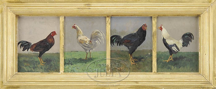 THOMAS ALLEN JR. (American, 1849-1924) PORTRAIT OF FOUR ROOSTERS. Interesting group of four oil on cigar box tops portraits of roosters standing on grassy ground. Housed in a gilt frame with a liner which has four windows. Each of the panels is Estate stamped on reverse and signed by Elizabeth Allen. Unsigned fronts. SIZE: Each panel 8″ x 6″. Overall including frame: 12″ x 29″. CONDITION: Very good. 9-99072 (2,000-3,000)