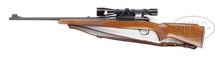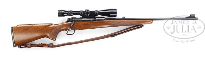 *WINCHESTER MODEL 70 FEATHERWEIGHT WITH GRIFFIN & HOWE DOUBLE LEVER MOUNT. SN 262592. Cal. 308. 22″ bbl, stippled ramp, silver bead front sight with hood, flip-up rear sight. Left side of bbl marked “WINCHESTER/TRADEMARK-MODEL-70-FEATHERWEIGHT/MADE IN U.S.A. WINCHESTER PROOF STEEL-308 WIN”. Standard Model 70 receiver, Griffin & Howe dbl lever side mount with Redfield 3×9 scope. Bolt with matching SN and solid bolt handle. Aluminum floorplate and trigger guard, with trigger guard engraved “RTC”. Mounted with standard featherweight stock, factory sling swivel in forend, checkered side panels, checkered pistol grip, Monte Carlo, 1/2″ brown Pachmayr recoil pad, factory sling swivel with Lawrence adjustable sling. CONDITION: Very fine. Bbl retains 97-98% orig blue with a few minor nicks & scratches. Receiver retains 98% of its matte blue finish as well as the Griffin & Howe side mount. Bolt handle has most of its orig blue slightly thinning on knob. Floorplate and trigger guard retain most of their factory anodized finish. Stock is sound with a few minor handling marks, nicks & scratches, retaining most of its orig finish. LOP is 12-1/4″. Mechanics are crisp with a nice shiny bore. Scope is clear with fine crosshairs. 4-38986 BDT132 (1,000-1,500)