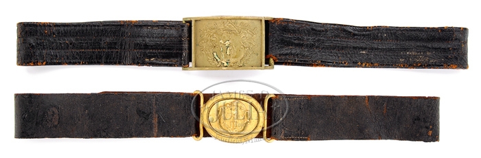 TWO MASSACHUSETTS OFFICERS BELTS. Two Massachusetts officers belts; one being an 1850 saber belt plate style and the second being an oval 2-pc. CONDITION: Overall good with 2-pc having several cracks in belt. 4-31583-1 BT0 (3,000-5,000)