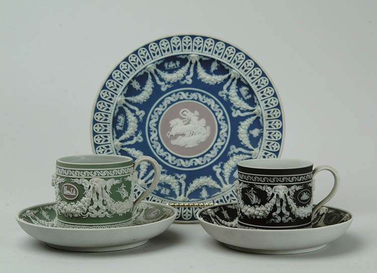 LOT OF WEDGEWOOD JASPERWARE. Lot consists of blue and white Jasper plate with white floral border and ram’s heads connected by floral sprays. Center mauve colored panel is decorated with carved chariot driver and horses. Black and white Jasper cup and saucer feature ram’s heads connected by floral sprays and alternating decorative panels in between. Other cup and saucer is same as first but in green and white. All pieces impressed “WEDGEWOOD”. CONDITION: Very good to excellent. 5-67524-210 (300-500)