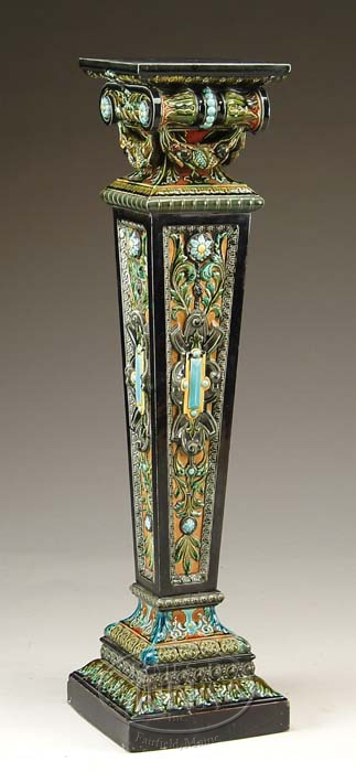 FINE MAJOLICA TALL PEDESTAL. Square top supported by a tapered square post with stepped base. Nice majolica glaze in blue, green, black and gold. Unmarked. SIZE: 45-1/2” h x 10-1/2” sq top. CONDITION: Base has restoration, some light chipping to base. Otherwise very good. 9-29874 (1,100-1,300)
