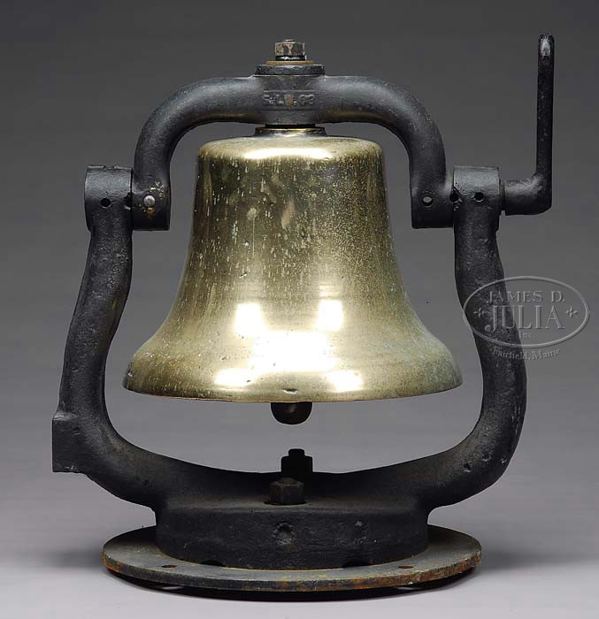 LARGE RAILROAD TRAIN BELL. Unusual mammoth and very heavy brass bell rests within a cast iron harp base on round disc. SIZE: Overall 26″ h, 16″ dia. CONDITION: Very good to excellent. Couple small chips and oxidation to one side. 1-9022 (1,500-2,500) Auction: Advertising, Toy & Doll - Spring 2009 Please Note: All prices include the hammer price plus the buyer’s premium, which is paid by the buyer as part of the purchase price. The prices noted here after the auction are considered unofficial and do not become official until after the 46th day. |
