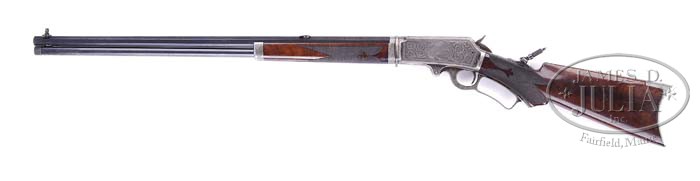 RARE FACTORY ENGRAVED MARLIN 1893 TAKE DOWN RIFLE. SN 149175. Cal. 30/30. 26″ oct bbl, full magazine take down, combination front sight with windage adjustment, Lyman two leaf flip-up rear sight. Top flat of bbl is marked “MARLIN FIRE-ARMS CO.NEW-HAVEN,CT.U.S.A/PATENTED.OCT.11,1887. APRIL 2,1889.AUGUST 1,1893.” Left flat behind rear sight is marked “SPECIAL SMOKELESS STEEL”. Each exposed flat has about 2″ of scroll engraving with “30-30” on top flat. Takedown ring has scroll and punch dot engraving as well as nosecap. Receiver marked “MARLIN SAFETY” on top has No. 5-1 style engraving, left side of an oval and wildcat surrounded by foliate scroll with punch dot background. Right side has setter behind loading gate, balance of foliate scroll with punch dot background. Top tang is mounted with peep sight. Mounted with nicely figured American walnut, with “C” style checkered pistol grip with serpentine cap, crescent steel buttplate, scroll engraved on top tang, deluxe forend with “C” style checkering. This fine gun comes from the granddaughter of the orig owner, Reverend George Wesley Peck. Reverend Peck was ordained a Methodist Minister in 1877 and was President of Hedding College from 1873 to 1881. From 1881 to 1898 he was pastor at numerous churches in the Buffalo, Rochester and Dansville area. In 1898 he was elected superintendent of Buffalo, Rochester, and Albany Districts of the Anti-Saloon League. He continued in this capacity until 1908 when he became superintendent of New York, Ohio, and Michigan International Reform League. Inspection of gun reveals matching serial numbers on left side of upper tang and inside toe of buttplate. PROVENANCE: Handed down directly through the Peck Family. CONDITION: Fine. Bbl and mag tube retain 90-95% orig blue, minor wear on sharp edges, usual minor nicks & scratches, a few small areas of minor surface oxidation and some thinning on bottom of mag tube. Receiver shows traces of orig case coloring that has mostly turned and blended with a silver patina. Hammer shows orig thinning case colors, blending with some silver. Lever shows thinning orig case colors in protected areas blending with silver and brown patina. Stock is sound with good checkering a few minor flattened points, usual minor nicks & dings, retaining much of its orig finish. Buttplate is mostly a silver/gray patina. Forend is sound with slightly flat checkering across bottom, normal nicks & dings and retains orig finish blending with hand worn patina. Mechanics are crisp, shiny bore with slightly dark grooves and a couple very fine shallow pits. 4-39235 BDT4 (12,000-15,000)