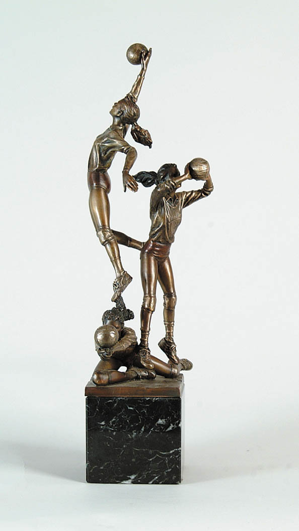 GEORGE W LUNDEEN (American, 1948-) “PLAYERS”. Bronze sculpture depicts three women volleyball players in different volleyball poses. Signed and numbered “No. 20”. Mounted on a square marble base. REF: www.lundeensculpture.com. OVERALL SIZE: 18-3/4” h. BRONZE: 15” h. CONDITION: Very good. 9-95535 (400-800)