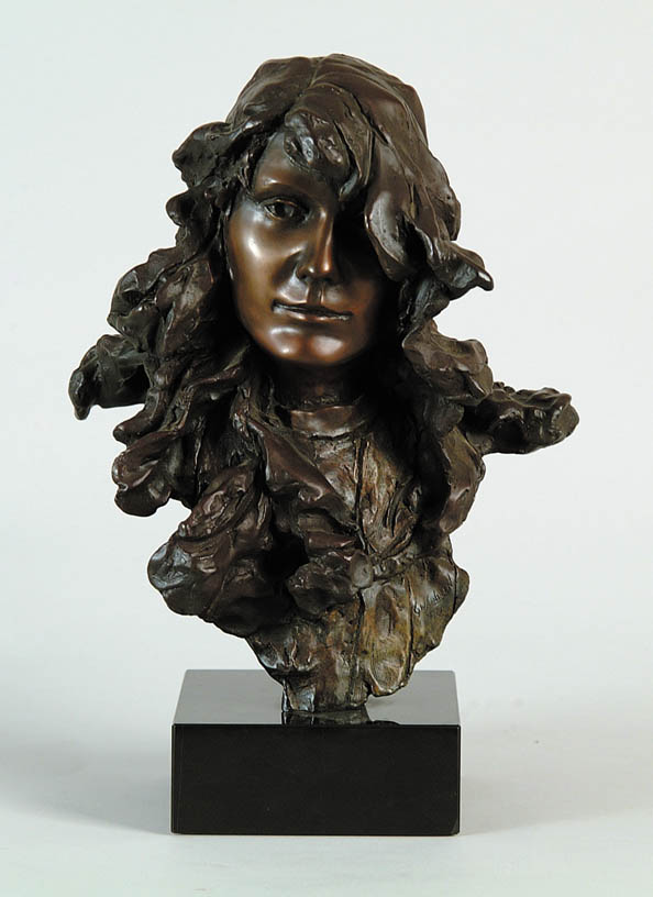 GEORGE W LUNDEEN (American, 1948-) BUST OF WOMAN. Bronze sculpture of a woman with flowing hair and scarf. Signed and dated 1979 with limited edition 8/12. Mounted on a square black stone base. REF: www.lundeensculpture.comOVERALL SIZE: 14”. BRONZE: 12”. CONDITION: Very good. 9-95533 (400-600)